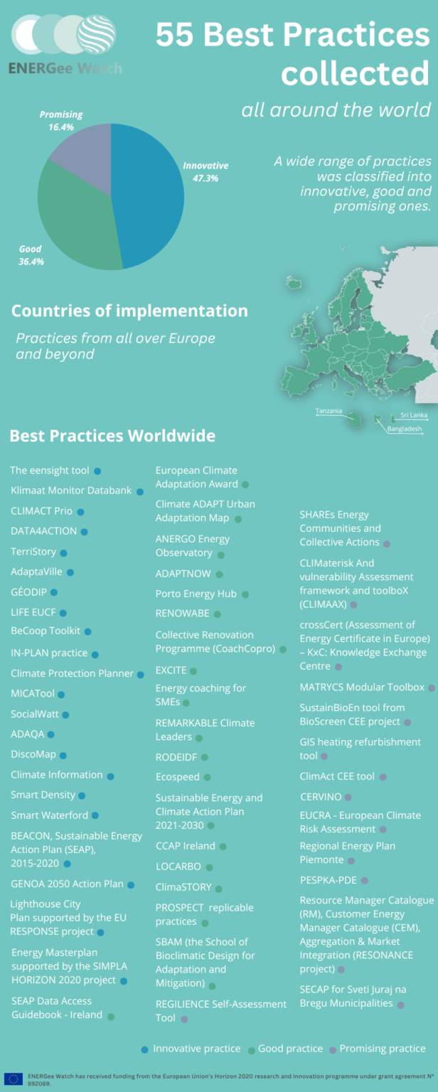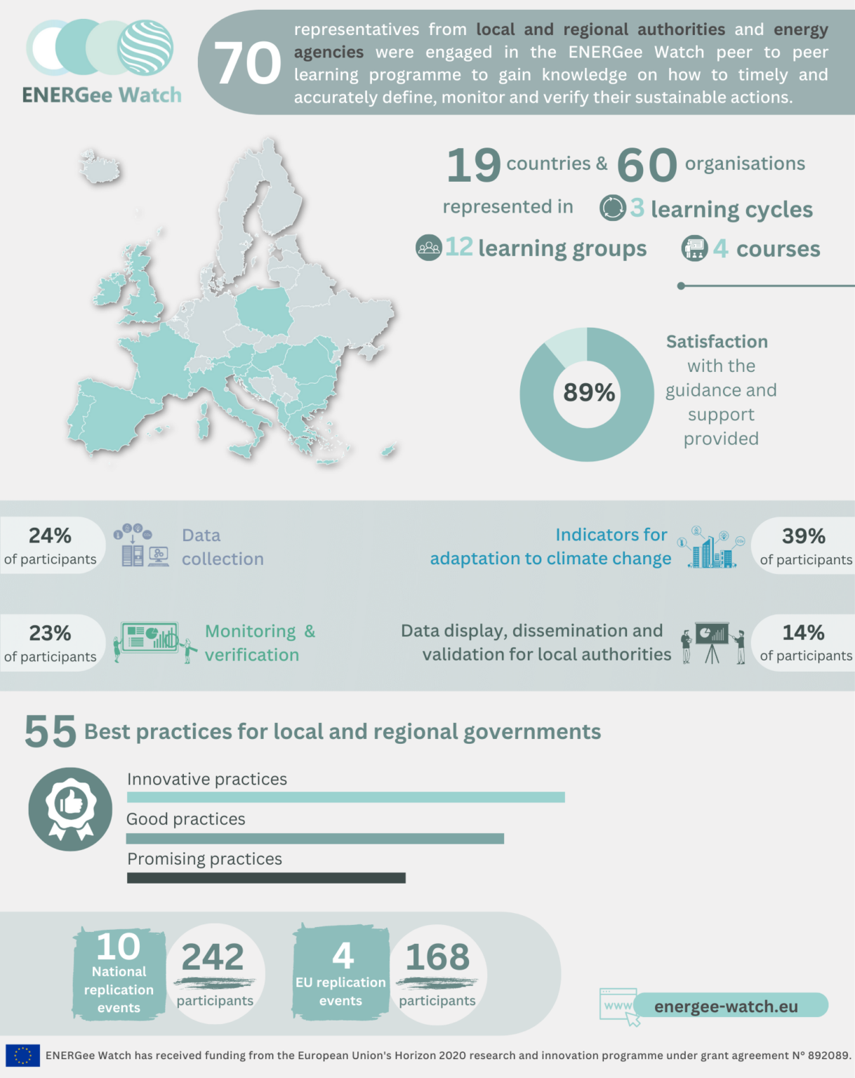 - The ENERGee Watch P2P programme brought together 70 mentees from 60 regional and local organisations around Europe, along with 18 observers, resulting in a total of 88 participants, to share and use the existing knowledge and information available on energy data for the purpose of creating better policies and sustainable action plans.