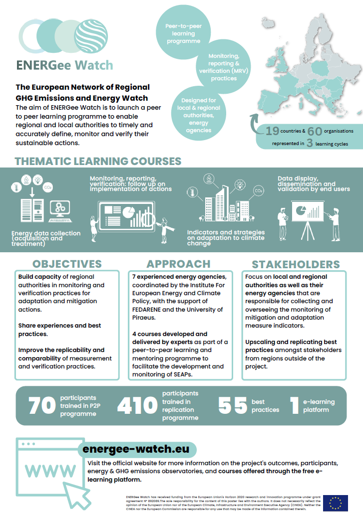 ENERGee Watch launched a peer-to-peer learning programme to enable regional and local authorities to timely and accurately define, monitor, and verify their sustainable actions as well as to strengthen collaboration and engagement among them. The learning focused on regional/provincial authorities and their agencies that are responsible for collecting and overseeing the monitoring of mitigation and adaptation measure indicators in order to empower them to make use of best practices. The project builds on the successful H2020 PROSPECT project and goes one step further by enabling accurate and successful data collection, dissemination and validation, monitoring and verification practices, and proper monitoring indicators in cities and regions across the EU. ENERGee Watch is an existing informal European network of regional greenhouse gas observatories managed by FEDARENE whose mission is to collect, monitor, report GHG Emissions and implement energy saving strategies and policies, to which the project brings this already existing informal network to a higher level by achieving specific and strategic objectives.