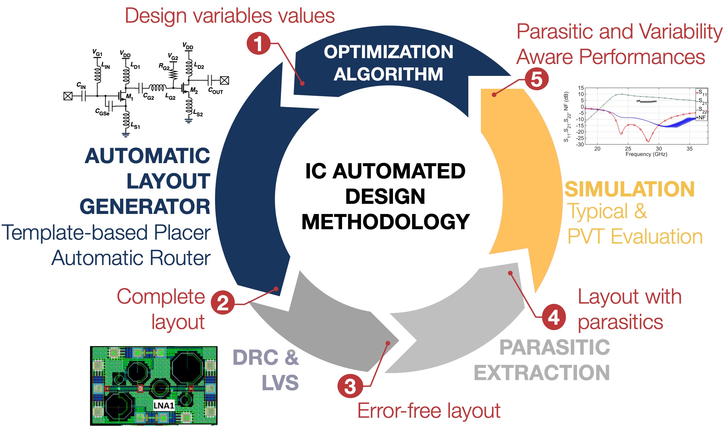 After developing the desired models for inductors and transformers, these have been integrated in a wider tool, for circuit automated design. Several designs have been achieved using such automated design methodology, from a low-noise amplifier, to a voltage-controlled oscillator and a power amplifier (all at 28GHz). A prototype was fabricated using this methodology (an LNA) and the specifications obtained are well above the state-of-the-art, proving that the SYSTEMIC-RF project was successful in developing a methodology that can help RF designers in achieving superior performances in an efficient manner.