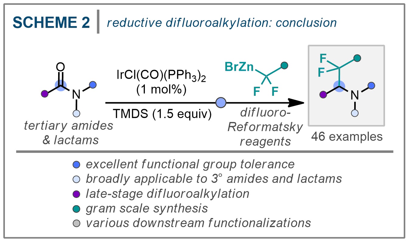 Conclusion: A broadly applicable and efficient method for the synthesis of acyclic and cyclic α-difluoroalkylated tertiary amines with good overall yields has been developed. The mild iridium-catalyzed reductive difluoroalkylation shows excellent functional group tolerance with respect to both coupling partners; amides/lactams and organozinc reagents, which is among other things highlighted by the late-stage derivatization of four drug molecules. Furthermore, the synthetic utility of this method was demonstrated by a satisfying performance on gram scale and several useful downstream functionalizations (Scheme 2).
