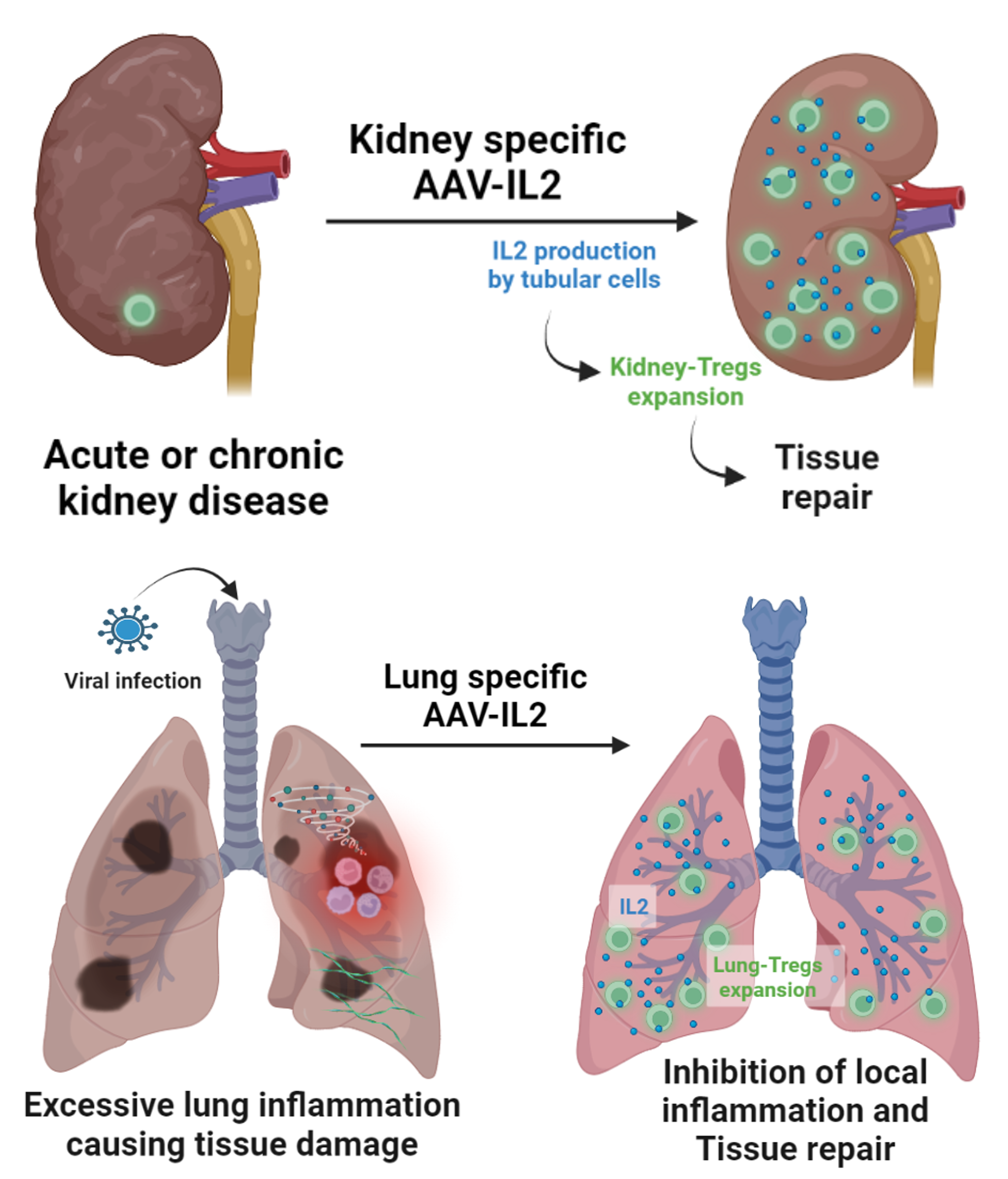 To expand Tregs locally, we used a strategy developed in the host laboratory that relies on IL2. IL2 is a proven growth factor for Tregs. Therefore, increased level of IL2 can drive Treg expansion, either systemically or locally. To expand Tregs located in the kidney, we designed AAVs driving the expression of IL2 under the control of kidney specific promoters described in the literature. We observed that intravenous injection of these AAVs in mice induces an up to ten times expansion of Tregs in the kidney. However, it also induces a massive expansion of Tregs and other immune cell types in the liver. Future work in the host laboratory will investigate other route of administrations, targeting more specifically the kidney, e.g. retro-ureteral route or intra-renal pelvis injection, to increase specificity to the kidney.