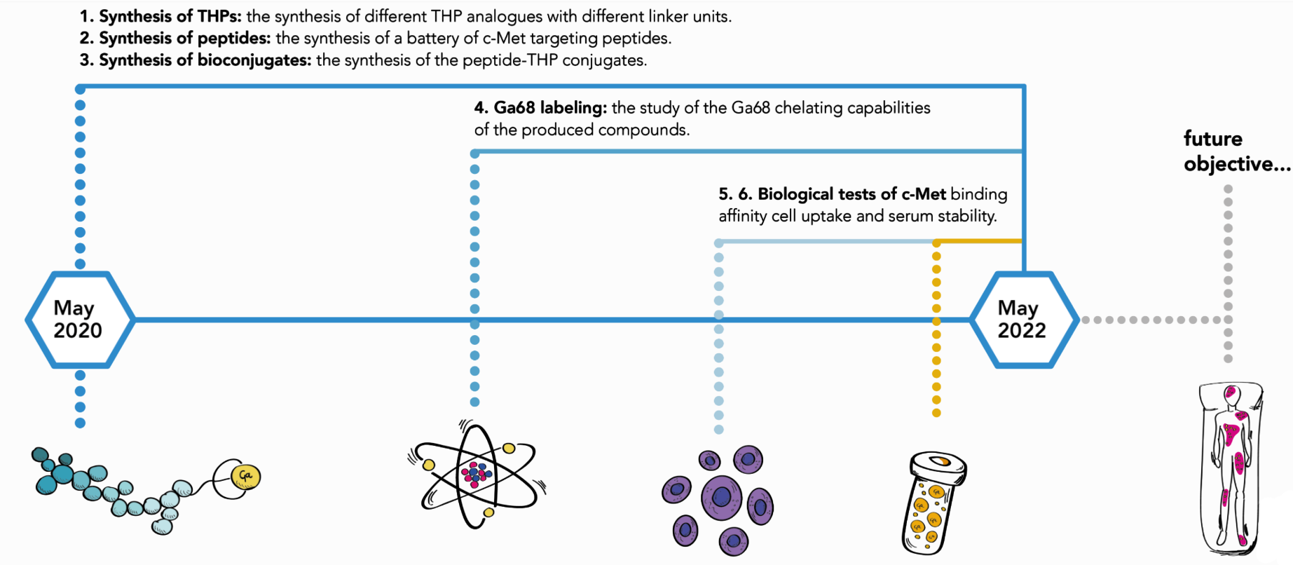 The project aims to accelerate the exploitation of a kit-based THP technology to produce a PET tracer for c-Met aberrant cancers using the advantages of gallium-68. Differently from the already reported c-Met PET tracers, the products derived from the ICG68-PROG have the advantages of using THP as the chelating unit for the gallium-68. This ensures a quantitative radiolabelling under mild conditions without eluate pre-processing or post-labelling purification to produce a single species. In fact, THP can complex gallium rapidly at room temperature and neutral pH, with high radiochemical yield and purity, reducing the costs of the production of the radiotracers. Moreover, the use of gallium-68, thanks to its availability from commercially available generators, will reduce the cost of the infrastructures associated with 18F and 11C tracer production and make it possible to use PET even for hospitals without an on-site cyclotron. Finally, the production of a peptide-based tracer, in contrast to an antibody-based one, will also reduce the cost of the production and, therefore, the cost of the final product. The combination of targeted imaging agents with PET allows non-invasive diagnosis of specific cancer types with precise delineation of tumors and metastases and thus disease staging. It is logical to believe that, in future clinical settings, non-invasive PET imaging with the developed radiolabeled tracers will support the diagnosis of c-Met overexpressed cancers, the selection of patients for c-Met–targeting drugs, and identify responding and nonresponding patients for such therapeutics. According to the ECIS (European Cancer Information System), cancer has a significant impact on society in Europe and worldwide. The three most common estimated new cancer cases are breast, lung/bronchus, colon/rectum for females and prostate, lung/bronchus, and colon/rectum for males. These types of cancer are also the ones that produce each year the highest number of deaths. Notably, many human tumor types, including the already cited, often have the c-Met receptor overexpressed. Considering only these four cases of cancer, each year, almost 7 million new cases worldwide are diagnosticated (2 million lung cancer, 1.3 million prostate cancer, over 2 million breast cancer and 1.8 million colon/rectum cancer); among them, 318,327 new cases of lung cancer, 335,514 of prostate cancer, 355,457 of breast cancer and 341,419 of colon/rectum cancer were estimated for 2020 for EU-27 countries by the European Cancer Information System. In these cancers, the overexpression of c-Met is well documented, resulting in a vast target clinical population per year of millions of potential patients worldwide and hundreds of thousands in Europe who will benefit from the results of the project. In this context, the products derived from the development of the project are creating powerful chemical tools for the detection of the most common and lethal cancers among Europe and worldwide, doing the project at the forefront for the fighting of a significant public health problem and primary interest for European citizens.
