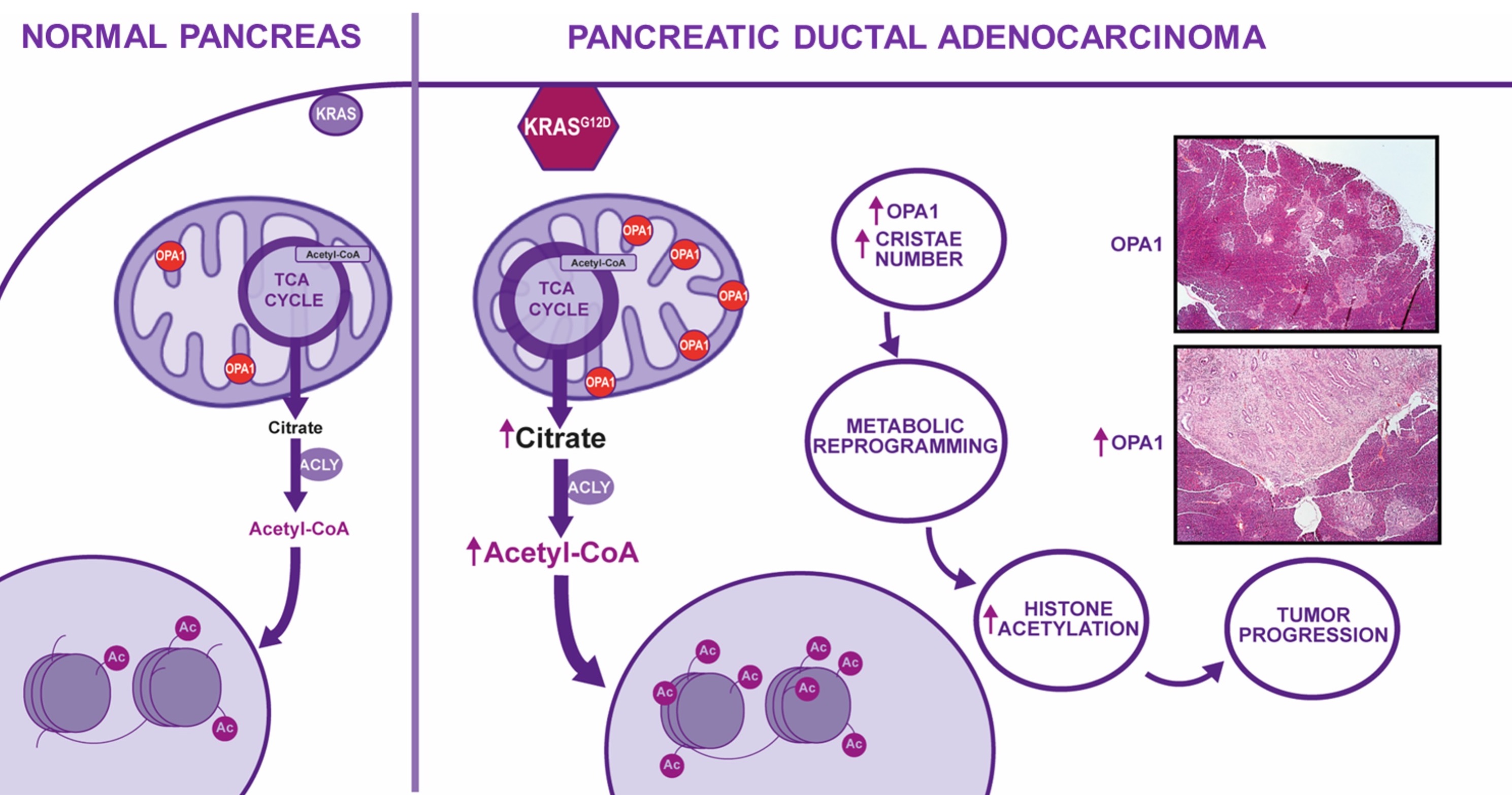 To test the hypothesis that OPA1 mediates mutant KRAS-induced epigenetic reprogramming in pre-malignant cells, histone acetylation was assessed in OPA1-overexpressing (OPA1tg) acinar cells, both ex vivo (Western Blotting) and in vivo (IHC). In both cases, OPA1tg -derived acini showed significantly higher levels of histone acetylation, without significant changes in NAD+ levels. As elevated histone acetylation facilitates PDA initiation (Carrer, 2019), we anticipated that OPA1 overexpression accelerates tumor onset. To this aim, we bred OPA1tg with KC mice to obtain KC;OpaTg mice that showed higher histone acetylation, specifically in pre-malignant areas. Histological evaluation of 4-month-old animals exhibited the presence of advanced carcinomas only in OPA1-overexpressing animals.