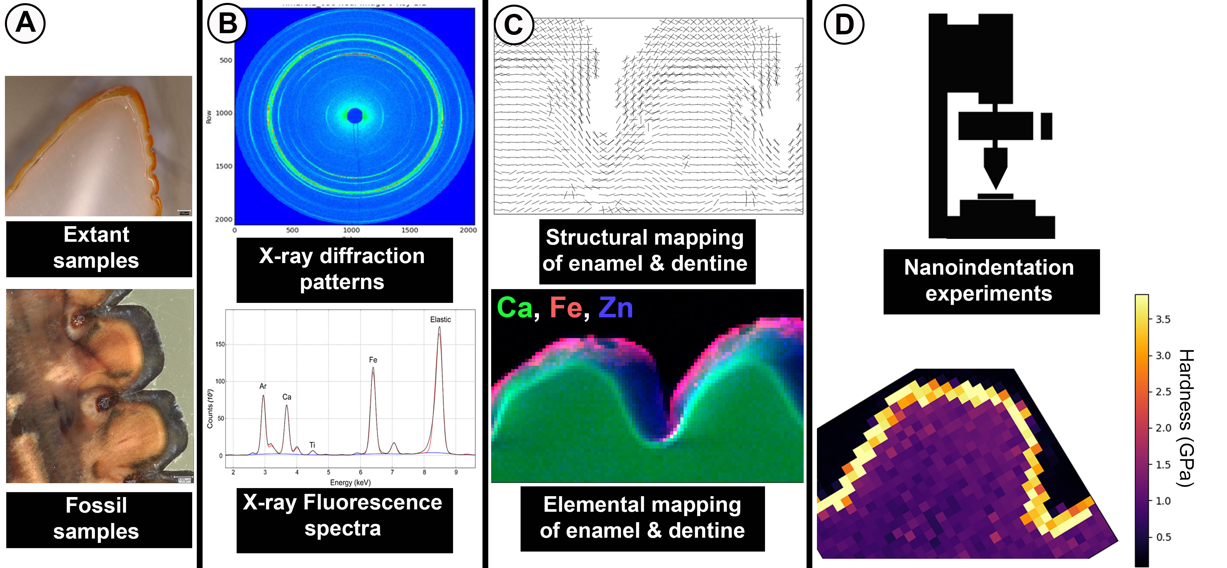 Successful applications and significant results from seven synchrotron experiments: The project relied on synchrotron-based experiments (X-ray diffraction/XRD, fluorescence/XRF, and nanotomography/XNT), which require the submission of competitive project proposals for instrument time at a select number of synchrotron facilities across the globe. From January 2021 to the end of the project (October 2022), ENEVOLVE resulted in six successful synchrotron beam time proposals directly related to the objectives of the project, and an additional synchrotron experiment aimed at developing a new imaging technique (experiment #7) at three synchrotron facilities in Paris, Grenoble, and Oxford. These multi-day experiments yielded several terabytes of quantitative data on enamel and dentine crystal structure in reptiles (tyrannosaurid dinosaurs, fossil and modern crocodylians) that are being analyzed for at least three key ENEVOLVE publications.