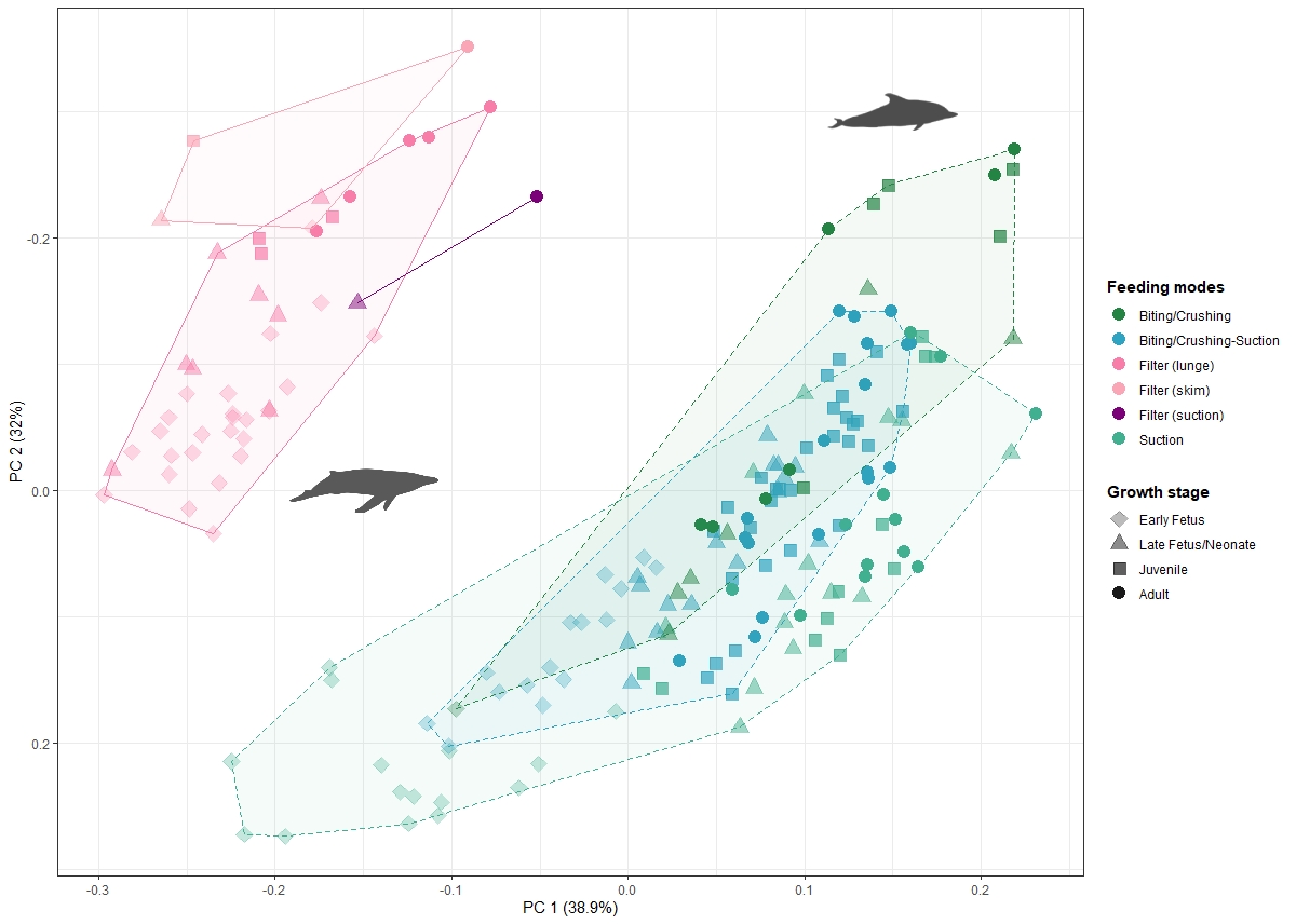 We collected 3D data and built a dataset comprised of over 200 specimens of Cetacea at all stages of development, from embryos to adult, and spanning the diversity of the group. Using this impressive dataset and novel GM, statistical and phylogenetic comparative methods we were able to answer our main research questions. 1) We found that skull asymmetry progressively increases during ontogeny, and the level of asymmetry at the early fetal stages as well as the distribution of asymmetry in the adults is directly correlated with the evolutionary history of the species, while the high or low levels of asymmetry displayed in the adults are directly correlated with the ecology and hearing adaptations of the species. 2) Examining ear bone development, we found significant differences in ossification sequence and shape ontogeny in the periotic bone between the two groups, baleen and toothed whales, but not in the tympanic bulla. This is directly related to both their common ancestry and adaptations for underwater hearing, reflected in the tympanic bulla, and their different hearing frequencies, which depend on the internal morphology of the periotic bone. 3) We are currently finishing examining the relationship between changes in skull ontogeny and evolution of different feeding adaptations across this group. Generally, we see convergent but not shared ontogenetic patterns in braincase development between baleen and toothed whales, reflecting their convergent evolution towards a telescoped cranium, where the bones overlap and the nasals are retracted towards the back of the skull. The rostrum ontogeny is more disparate, reflecting major ecological differences particularly among toothed whales.
