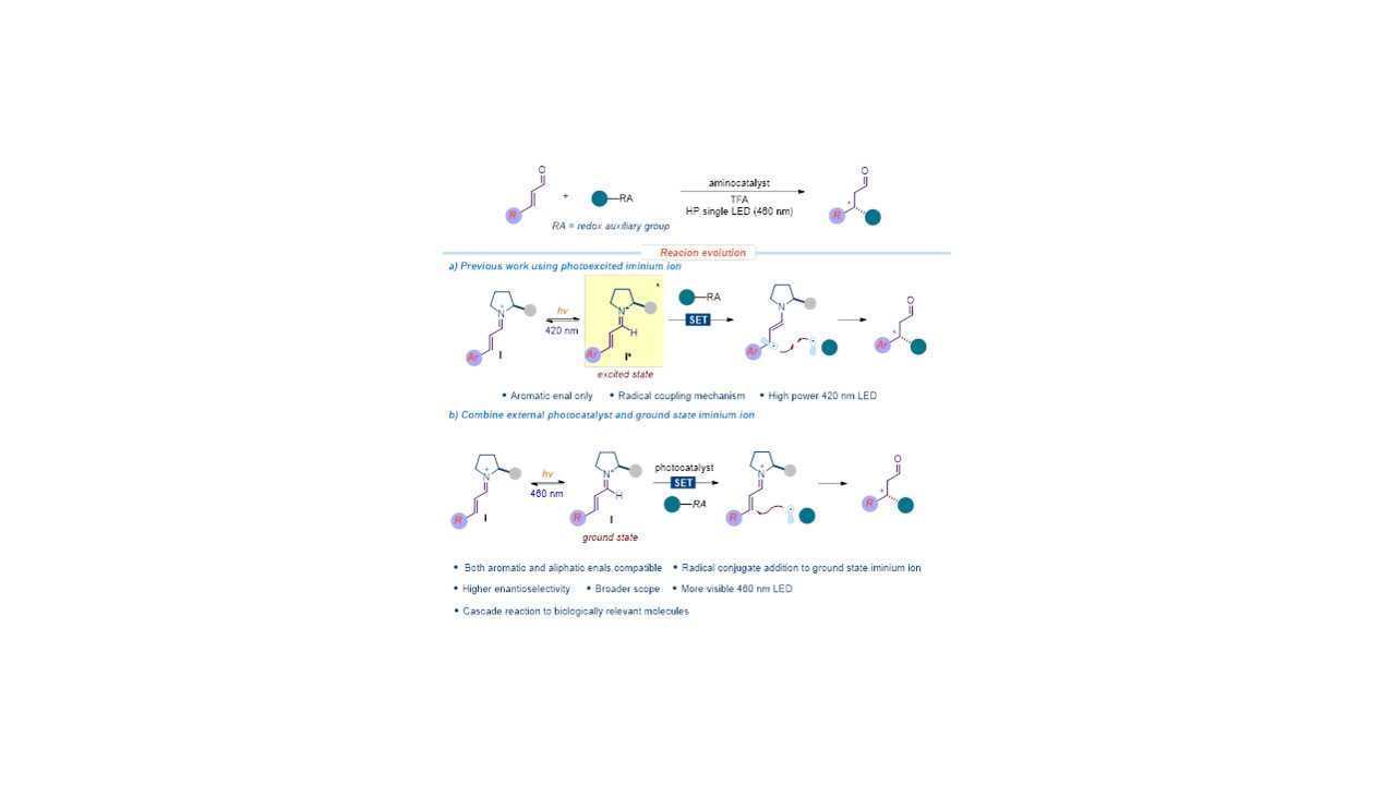 (1) A general iminium ion-based catalytic method for the enantioselective conjugate addition of carbon-centered radicals to aliphatic and aromatic enals was developed. The process uses an organic photoredox catalyst to generate radicals, in combination with ground state iminium ion, secures a consistently high level of stereoselective interception of a wide variety of radicals, including non-stabilized primary ones which are generally difficult to engage in asymmetric processes. The system also served to develop organocatalytic cascade reactions that combine an iminium-ion-based radical trap with an enamine-mediated step, affording stereochemically dense chiral products in one-step. This work has been published in Angew. Chem., Int. Ed. 2021, 60, 5357, and highlighted by Synfacts 2021, 17, 325.