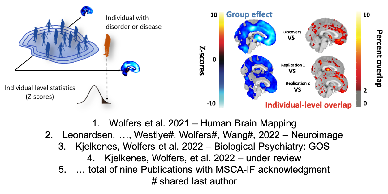 The intricacies of the human mind and its disorders are one of the remaining modern-day enigmas. Whereas recent advances in brain imaging and genetics are currently changing the clinical neurosciences by identifying novel general mechanisms of complex traits underlying risk and resilience at the group level, our understanding of individual-level causes and mechanisms of mental disorder has remained almost unchanged which is important because clinical management must be performed at the individual level. During the Marie Sklodowska Curie Actions-Standard European-Individual Fellowship (MSCA-SE-IF) Thomas Wolfers addressed this challenge by expending the normative modelling framework. During the period of the fellowship Thomas published nine articles with the MSCA-IF acknowledgement with the main outcomes: 1) I developed cognitive and genetic normative models, 2) scaled the normative modelling framework to become relevant for genetic analyses, 3) contributed to deep learning approaches for ageing, transfer learning and disease/disorder predictions, 4) mapped various disorders and diseases, 5) replicated our findings in independent publications 6) contributed to the organisation of various courses and workshops and 7) gave talks at various universities world-wide. This work resulted in a successful application for a research group leader position at the University of Tübingen in Germany. With my emerging “Laboratory for Mental Health Mapping ( https://mhm-lab.github.io )”, I will continue and refine the work started during this fellowship building an independent research line. Thus, the results of this fellowship will be further exploited and developed.