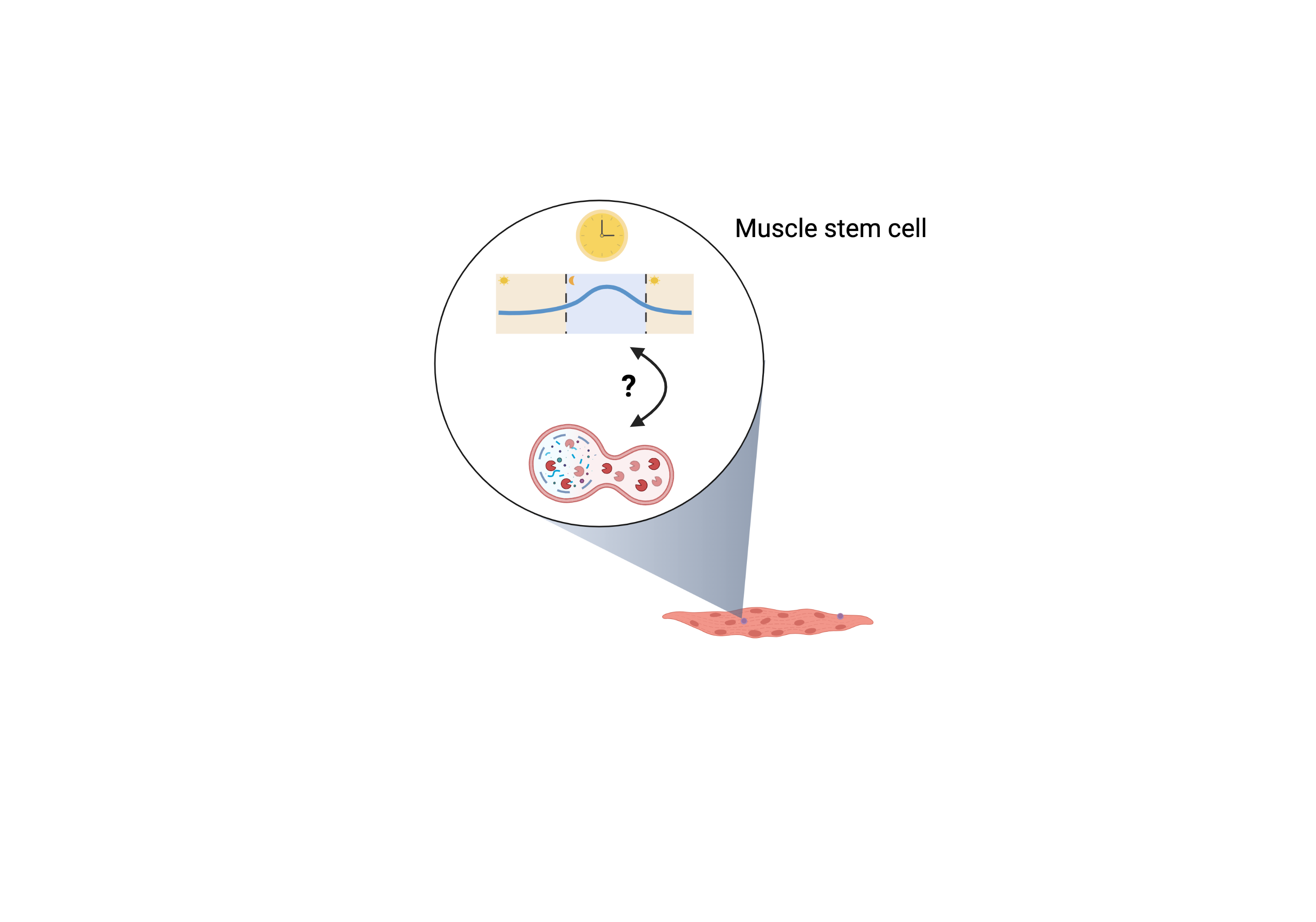 The light-synchronized central clock has classically been thought to be dominant over clocks in peripheral tissues, however, recent reports have highlighted a role for local peripheral clocks themselves in governing their own rhythmic programs. It is increasingly established that oscillations are the result of integrated signals that comes from external cues as well as inter- intra-organ communication signals. How this regulation impinges on stem cells is unknown as in part due to technical challenges associated with working with these cells, as well as the previous lack of suitable animal models. To address this, we dissected the contribution of the local intrinsic clock 1) in a system where only MuSCs lack the clock regulator Bmal1, and 2) in a system in which the clock is reconstituted in MuScs in an otherwise Bmal1-null context. Overall, this ambitious project aimed to elucidate: (i) the impact of circadian rhythms on MuSCs by investigating the contribution of the cell-intrinsic (local) clock to their homeostasis, (ii) the crosstalk between the central and local clocks by specifically restoring the clocks in these two types of cell/tissue in an otherwise arrhythmic model (iii) the contribution of autophagy in MuSCs circadian regulation.