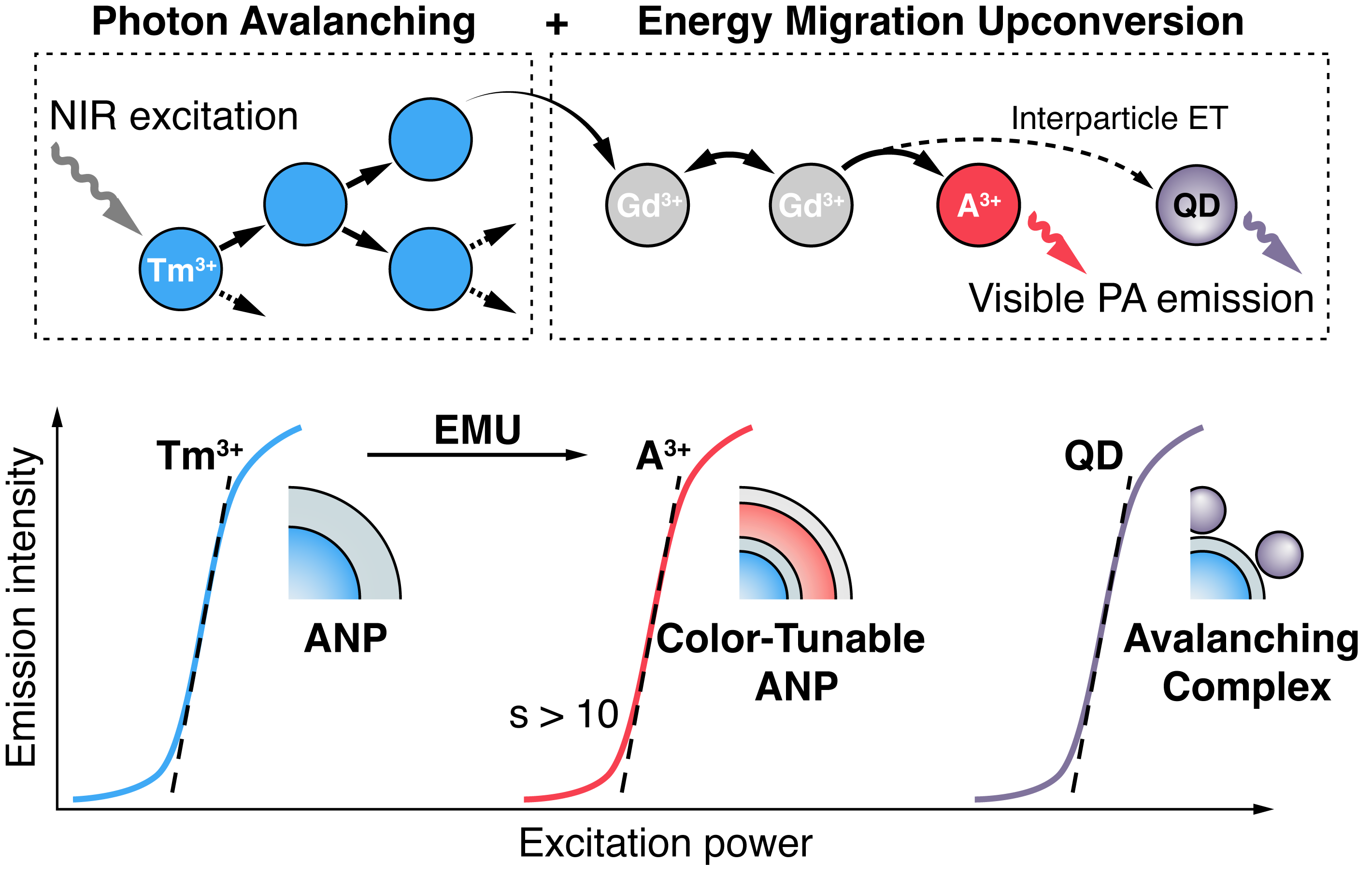 This project aims to explore different RENP architectures, including highly nonlinear photon avalanching nanoparticles (ANPs) and their excitation pathways to aid in creating a set of specialized nanotools for future biomedical and technological applications. To reach different milestones of the project, numerical simulations, high-throughout robotic synthesis, and complete optical characterization are combined to create and investigate state-of-the-art RENPs. In turn, these approaches and guiding principles were successfully applied in the course of project MONOCLE, yielding 1) the synthesis method for a new class of host material for RENPs, 2) the development of a generalized approach to tune the color of photon avalanches and imprint photon avalanches on virtually any linear emitter, and 3) the discovery of an extremely nonlinear photoactivation dynamic that transforms ANPs into bistable ANPs - having two distinct steady-state responses under identical excitation conditions, contingent on the history of excitation intensity.