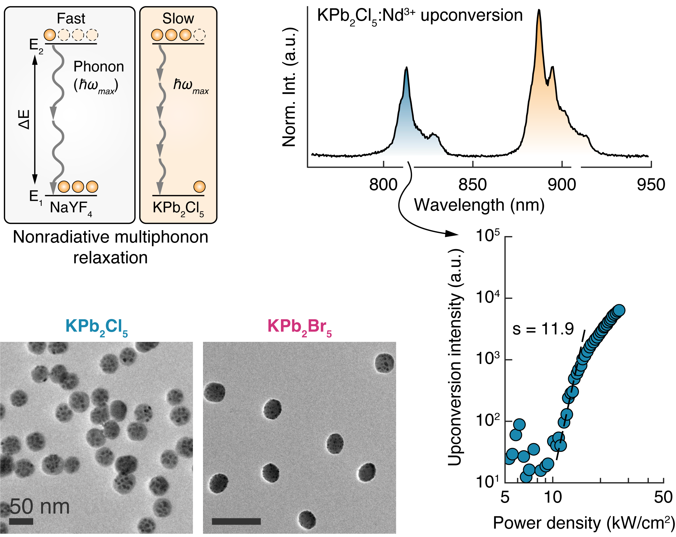 Furthermore, novel low-phonon-energy upconverting RENPs were developed during this project in collaboration with Dr. Zhuolei Zhang at the Partner Organization (Figure 2). Reducing the phonon energies of host material can potentially boost the upconversion emission intensity, yet it is challenging to synthesize low-phonon-energy upconverting nanocrystals. Different compositions of KPb2X5 (X = Cl, Br) RENPs with the lowest phonon energies available were synthesized and characterized by developing a new synthesis approach. Successful development of these RENPs facilitated lowering the host matrix's phonon energies to the extent that photon avalanching emission in Nd3+-doped KPb2Cl5 under 1064 nm excitation could be observed for the first time. Photon avalanching with Nd3+ has been predicted theoretically, however, previous attempts to detect it in the stat-of-the-art hosts (e.g. NaYF4 or NaGdF4) have been unsuccessful. Results of this study were published in Angewandte Chemie International Edition, 62, e202212549, 2023. The published manuscript was also deemed a "Hot Paper" and highlighted by a frontispiece graphic.