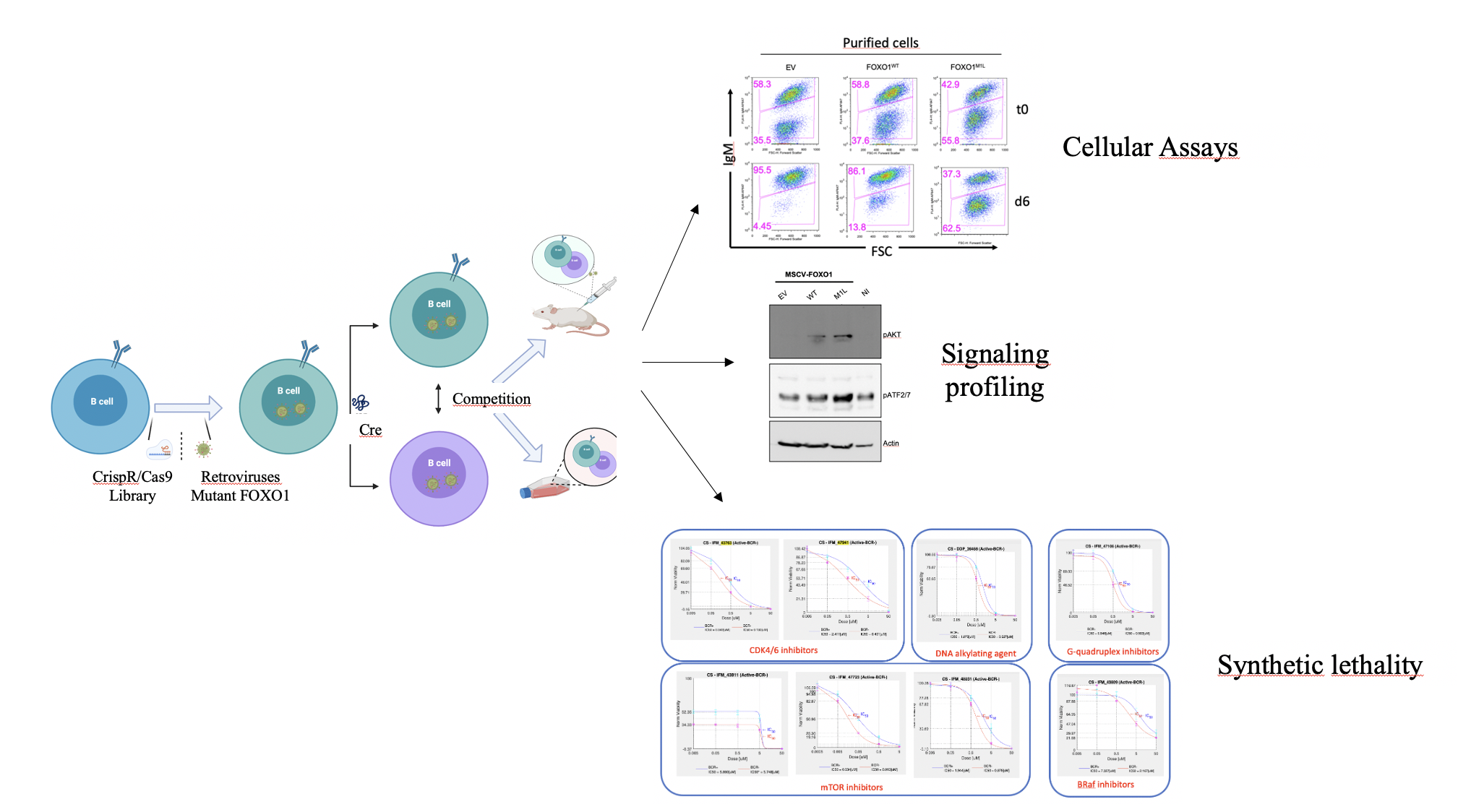 Based on extensive publicly available literature and preliminary data, we believe that interference with BCR expression/signaling delivers functional and mechanical cues that are interpreted by lymphoma cells as “death signals”, particularly in highly competitive and physically-contained microenvironments, such as the germinal center. We propose that FOXO1 mutant lymphomas resist better to stress-induced apoptotic signals by tuning signaling activities and cellular machinery to efficiently adapt to both cell-intrinsic (i.e. metabolic response to nutrient starvation) and cell-extrinsic components, with the latter contributed by solicitations imposed on the malignant B cells by the tumor microenvironment and immune recognition, eventually favoring the selection of mechanisms to escape from immune surveillance. The identification of vulnerabilities in aggressive B cell lymphomas and of synthetically lethal interactions between BCR-deficiency and specific cellular pathways, paves the way for the development of innovative tailored-designed therapeutic strategies, endowed with high efficacy and specificity, avoiding/reducing the off-target effects derived from intensive chemotherapeutic regimes, and potentially overcoming the acquisition of resistance to therapies, facilitating clinical management of lymphoma patients, and overall improving their quality of life.