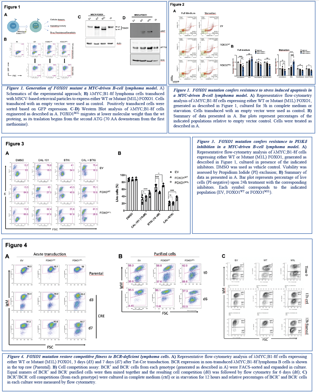 Experimental activities carried out over the course of the action produced a significant amount of data coherently pointing towards the ability of FOXO1 mutations to rewire signaling activities in MYC-driven B cell lymphomas, to ultimately favor the acquisition of improved fitness, particularly in BCR-less cells, as demonstrated combining biochemical and cellular assays. Cellular mechanisms underlying the competitive advantage promoted by FOXO1 mutations in BCR-dependent lymphomas have been in part disclosed and reconducted to a reduced sensitivity to stress-induced apoptosis. It is also relevant to highlight that this effect was not strictly associated with BCR-deprived lymphomas, as it was also observed independently of BCR-expression, potentially allowing to extend these findings to a broader spectrum of B-cell malignancies (and not only those whose pathogenesis relates to the biology of the BCR). Results generated during the action are currently being further confirmed in a) at least 3 independent mouse lymphoma lines, retrovirally engineered to express FOXO1 mutations; b) CRISPR-Cas9 genetically engineered mouse MYC-driven lymphoma lines carrying FOXO1 Gain-of-Function (GOF) or Loss-of-function (LOF) mutations, and c) in human primary tonsil-derived germinal center B cells, immortalized upon enforced expression of specific oncogenic combinations (i.e. MYC/BCL2/BCL6). These cellular models have been generated within the timeframe of the action, and will represent an invaluable platform to address biologically relevant questions in the field of B-cell lymphomagenesis. Data generated during the action using these cellular models suggested a dual contribution of the BCR in the pathogenesis of B cell lymphoma, highlighting a cell autonomous regulation of lymphoma growth ensuring cellular fitness, while favoring tumor expansion in vivo hampering immune-recognition of lymphoma B cells, through the regulation of immune-related receptors, providing a roadmap to disclose mechanistic insights explaining differential in vivo dynamics of expansion and growth rates between BCR+ and BCR-deficient lymphomas. These observations become particularly relevant given the increasing genetic/genomic data on primary B-cell malignancies confirming the presence of FOXO1 mutations in a variety of B-cell lymphomas, characterized by different cell-of-origin, BCR-status and/or genetic/molecular features. As part of our dissemination plan, a manuscript describing these results is currently in preparation. Moreover, findings with some commercial potential will be intellectually protected and economically exploited thanks to the support of the Technology Transfer Office at IFOM-ETS. Finally, results stemming from this project have already been inspirational for the generation of novel hypothesis-driven research activities, which have been exploited for the preparation of competitive grant applications, one of which (American Society of Hematology, Global Research Award) has been already funded. Dissemination and outreach activities towards both scientific (through the attendance to national and international workshops, meetings and conferences to share our most recent advancements) and non-scientific communities (public outreach in schools, social media, in-person interactive events involving local communities with diverse social and educational backgrounds) have been extensively carried out throughout the action.