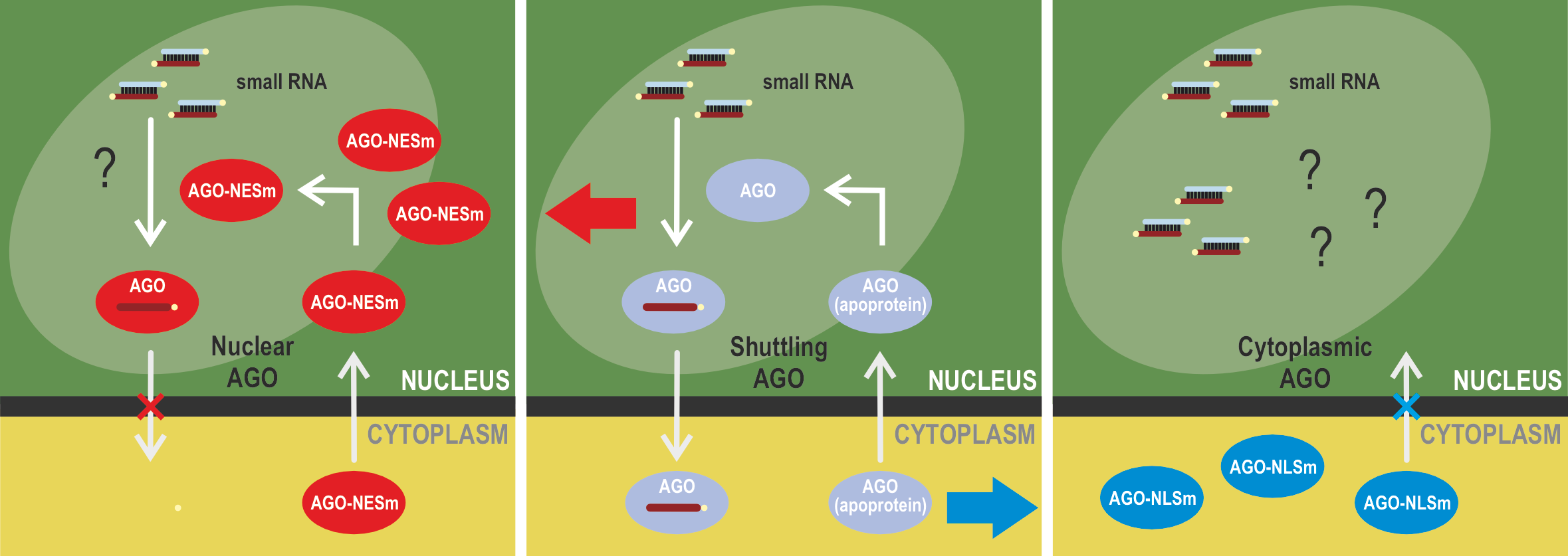 Finally, we focus on Arabidopsis AGO1 protein. Because we had thoroughly characterized the pathways for nuclear import and cytoplasmic export, we were able to generate three versions of this protein, a cytoplasmic-only, a nuclear-only and the wild-type, that it able to move between subcellular compartments. Then we isolate them and using next generation RNA sequencing we identify the different small RNA that are loaded in each of the subcellular compartments, thus describing the complexes that can initiate small RNA-target regulation. This allows us to develop a model framework to understand how AGO proteins control the small RNA cellular partitioning and their final mode of action in plants.