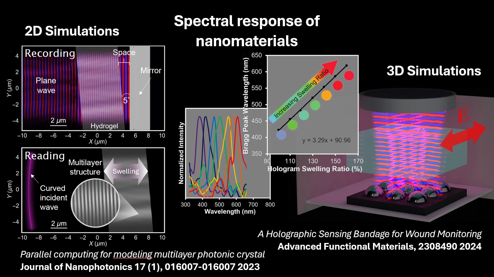 • Development of Optical Sensors: Innovative, functionalized nanostructured elements for optically based sensing mechanisms were created, surpassing existing technologies in sensitivity, reversibility, and conformability. Achievements include a conformable holographic pH sensing bandage for wound monitoring (DOI: 10.1002/adfm.202308490) holographic alcohol sensors (DOI: 10.1021/acssensors.0c02109) and reversible photonic hydrogel sensors for continuous pH monitoring in biological fluids (DOI: 10.1016/j.bios.2022.114206). These sensors hold potential for applications in healthcare, point-of-care diagnostics, and industrial biotechnology, with research findings disseminated through high-impact publications and conference presentations.