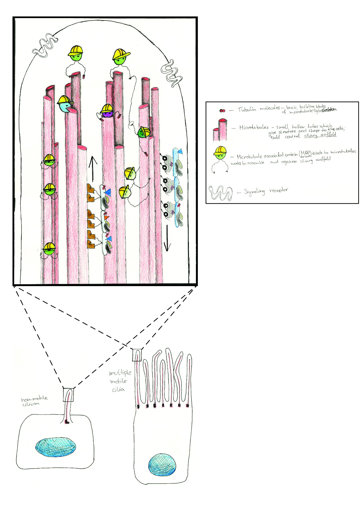 The basic structure of both non-motile and motile cilia is very similar, as they contain the main central cytoskeletal scaffold and membrane around it. How this cytoskeletal scaffold is built and maintained is still not completely understood, and yet, the defects in its assembly and organization are the major causes of ciliopathies. Objectives of this Marie Skłodowska Curie Action (MSCA) have been to resolve: (1) how the proteins that cause ciliopathies build the ciliary scaffold and how this affects the function of both non-motile and motile cilia; (2) how they control the overall stability of that ciliary scaffold and the very tip of cilia; and (3) to identify the protein content of non-motile and motile ciliary scaffold and find the potential new causes shared between primary and motile ciliopathies. Another important goal of the MSCA Individual Fellowship is to foster the development of this individual researcher. The fellow and the researchers in the host laboratory resolved the localization and function of ciliopathy-related protein in detail in both non-motile and motile cilia, as well as synergistic action with other important proteins for cilia formation and function.