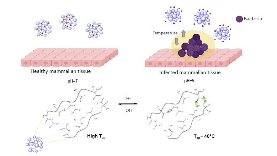 Incorporating an acidic monomer enables NGs to undergo a volume phase transition triggered by acidic conditions. The synthesis conditions were optimized to obtain NGs with low-polydisperse size distributions. In the case of IA, we found that the different monomer polymerization kinetics (compared to NIPAM and Ac-dPG) produced polydisperse NGs. Other synthetic approaches like semi-batch and core-shell-like NGs synthesis were tested. However, any of them allowed to obtain NGs with acceptable polydispersity index. Following up, we further characterized NIPAM-co-AA and NIPAM-co-MAA NGs by HNMR and FT-IR to confirm the actual composition of each monomer in the NGs. Also, the morphology and mechanical properties were explored by AFM, which revealed that our NGs were highly hydrophilic, with a spherical sponge-like appearance. The thermoresponsive properties were explored by UV-Vis at pH 5 and 7, corresponding to the pH of an infected and healthy udder, respectively. We found an exact percentage of MAA and AA monomers in the feed optimum to obtain thermo-response only in acidic conditions. Small angle X-ray scattering studies have been performed in Alba synchrotron to confirm the structure of the NGs. These results revealed notable structural changes with the temperature in acidic conditions. Then, we used the two specific samples with thermoresponsive at only acidic conditions for further experiments, like in-vitro drug release and antimicrobial activity.