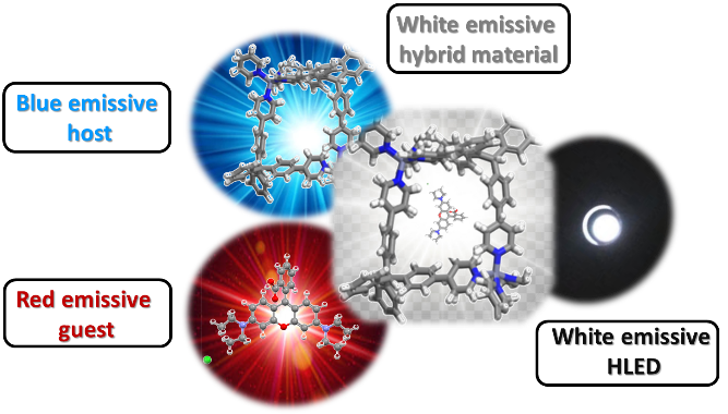 The MOFs are based on an organic moiety, called ligand, and a metallic node. The latter is, for sustainable and cost purposes, zinc, zirconium, aluminum, or magnesium. The syntheses, purifications, characterizations and photophysical properties of hosts (MOFs) and guests (Cu(I)) complexes and organic emitters were timely achieved. However, the implementation of host-guest systems based on Cu(I) was not successful, despite numerous trials. This was related to i) the guest is too big to enter the hosts’ pore size; and/or ii) the guests are too instable and get oxidized/degraded before entering the hosts’ pore size. Therefore, Cu(I) complexes were replaced by organic dyes, since they are smaller and more stable in solution. In this regard, white emissive hybrid materials, and consequently WHLEDs, were successfully achieved. In a sociological point view, this project goes beyond the state-of-the-art in a sustainable approach.
