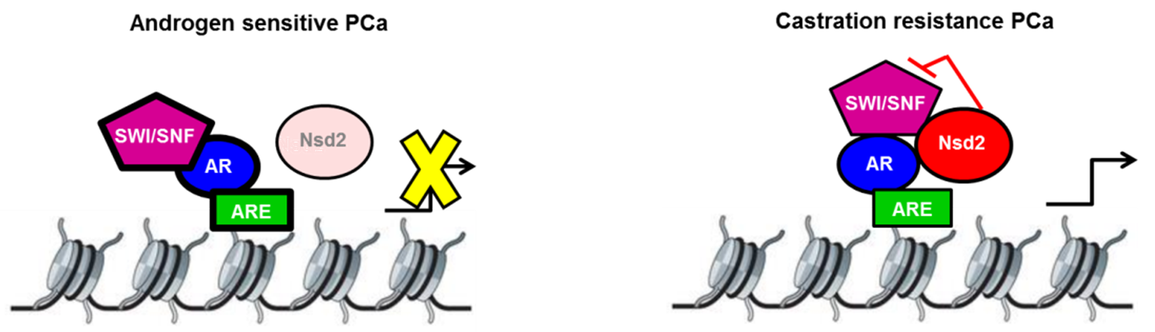 Dr. Rana EL BIZRI (MSCA-IF recipient) and her mentor Dr. Alvaro Aytes concluded during this action that (i) Nsd2 overexpression co-operates with AR to drive metastatic CRPC and resistance to anti-AR therapies; (ii) Nsd2 antagonizes with the SWI/SNF complex and confers resistance to AR signaling inhibitors; (iii) Nsd2 is a potential therapeutic target to re-sensitize metastatic CRPC to anti-AR therapies; (iv) and that targeting the core component of SWI/SNF subunits in the presence of Nsd2 is not efficient to re-sensitize metastatic CRPC to anti-AR therapies. Together, our data suggests that Nsd2 overexpression drives aggressive castration resistant and androgen independent PCa in part through destabilizing SWI/SNF interaction and altering the specificity of the AR cistrome.