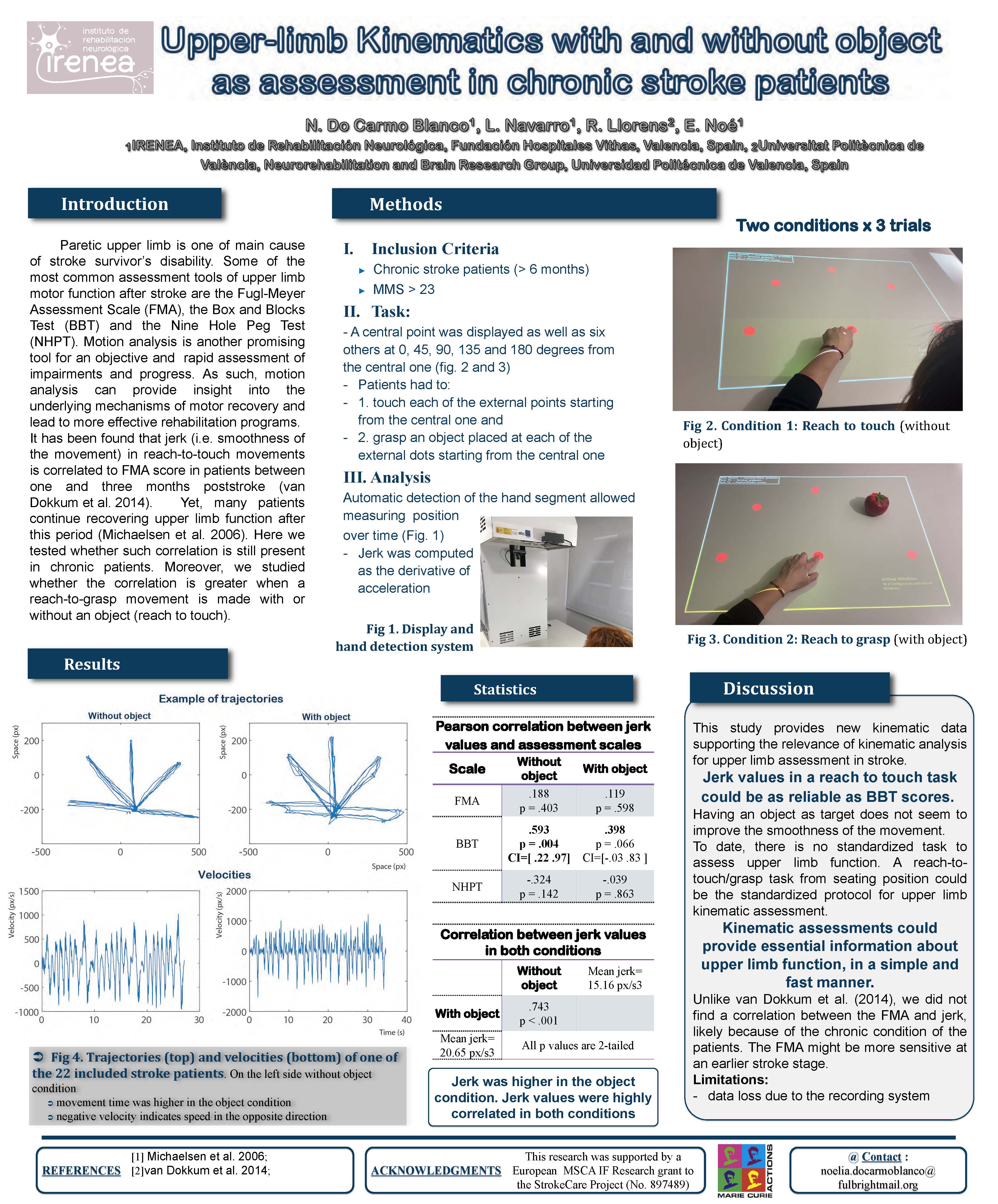 The kinematic experiment is also very innovative. It has been found that jerk (i.e. smoothness of the movement) in reach-to-touch movements is correlated to the Fugl-Meyer Assessment Scale (FMA) score in patients between one and three months post-stroke (van Dokkum et al, 2014). The FMA is the most widespread assessment tool for motor stroke recovery. Although slower, many patients continue recovering upper-limb function after the first 3 months post-stroke (Michaelsen et al., 2006). In the second study of the project, it was tested whether a correlation between jerk and FMA score is still present in chronic patients.