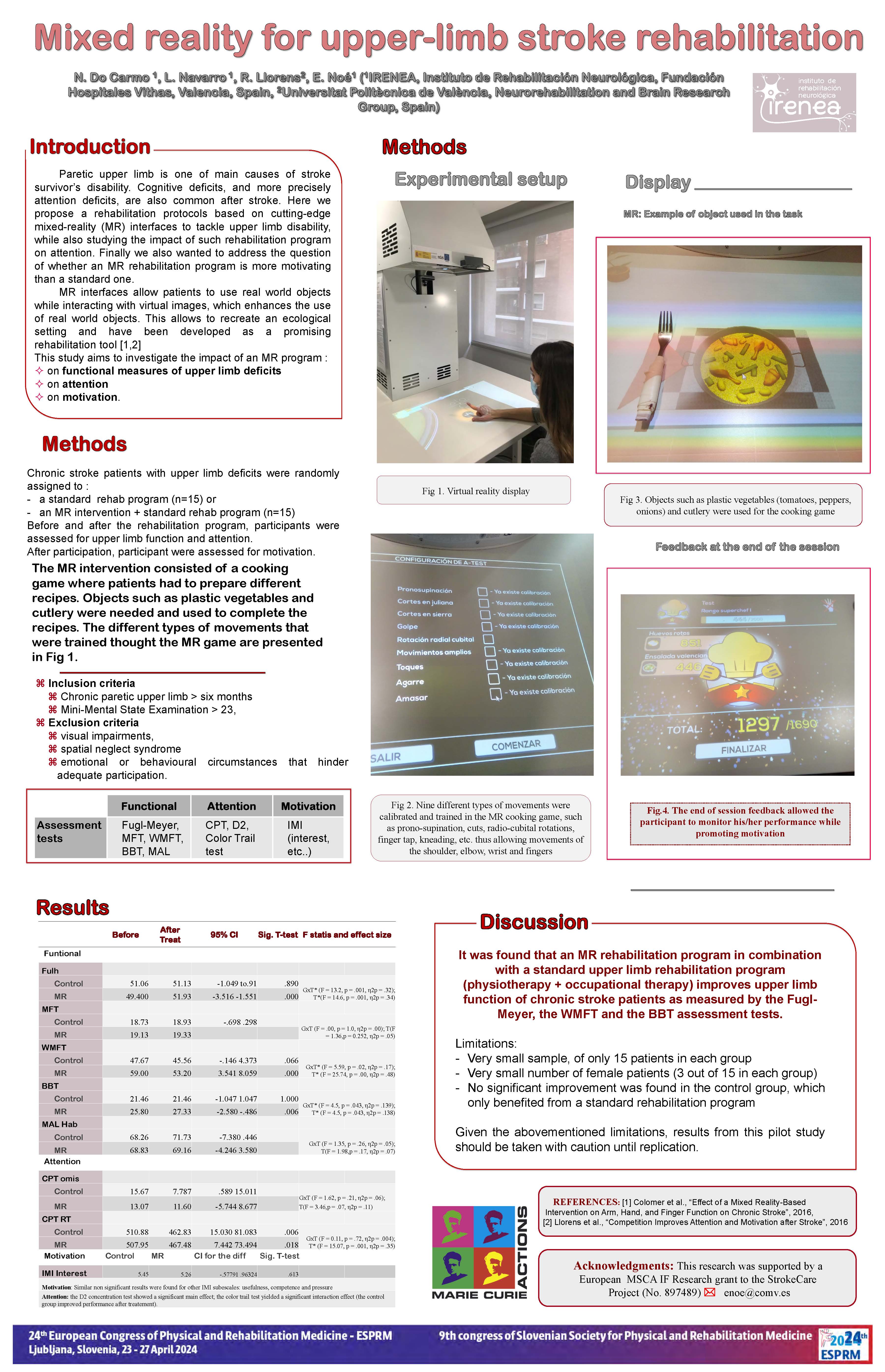 In terms of societal impact, the project demonstrates Mixed Reality (MR) technology's potential to revolutionize stroke rehabilitation through technological advancements, interdisciplinary collaboration, and data-driven personalized interventions. MR's scalability and cost-effectiveness offer promising market opportunities, particularly with the healthcare sector's shift towards digitalization. This project aligns with European policy objectives by promoting high-quality healthcare, digital transformation, and social inclusion through improved rehabilitation methods. Potential users, including healthcare providers, policymakers, and the scientific community, benefit from understanding MR's efficacy, ultimately supporting its broader adoption in clinical practice. The innovative cooking game and kinematic experiments further highlight MR's ability to provide engaging, personalized, and adaptive therapy, significantly benefiting stroke patients and therapists.