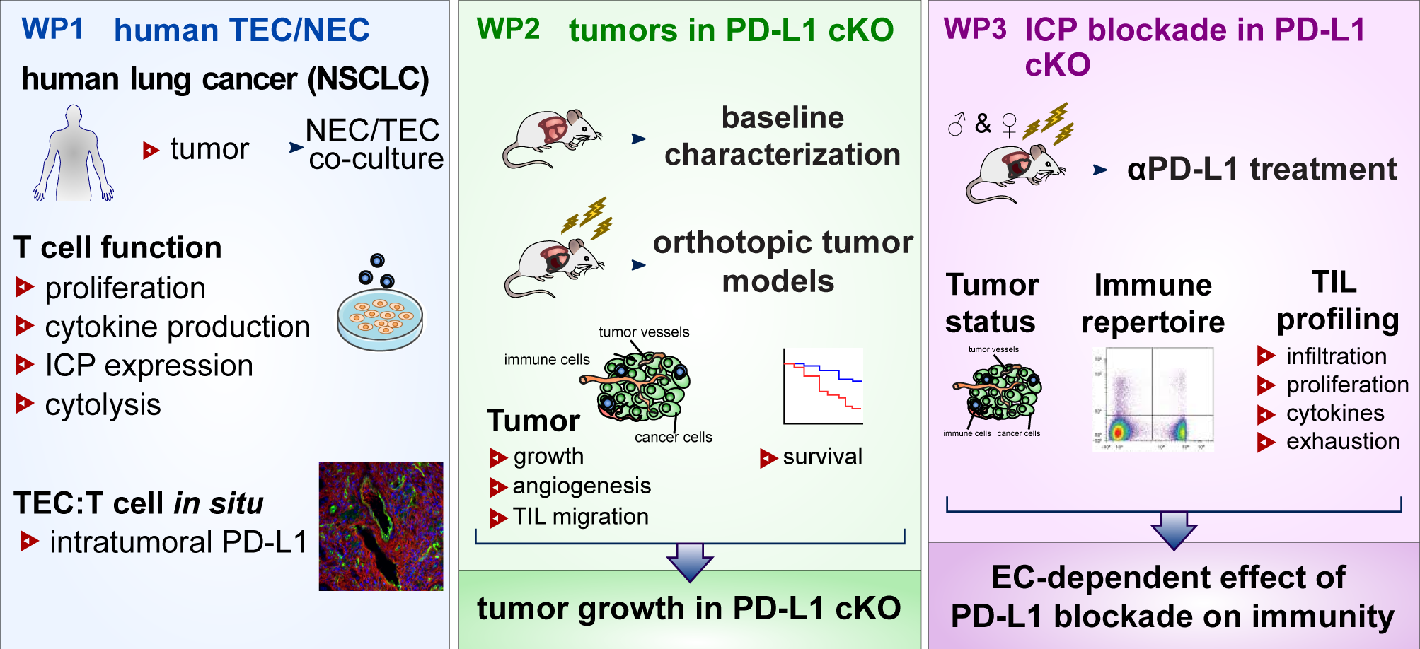 PD-L1 has been described to be upregulated on tumor ECs, but how this contributes to tumor immunity and whether it affects immunotherapy response requires further elucidation. Because PD-L1:PD1 interactions impair T cell proliferation, cytokine production and survival, PD-L1 on tumor ECs could impair T cell-mediated anti-tumor immunity even before T cells encounter any other tumor-associated cell. The endothelium is being increasingly viewed as a critical non-hematopoietic component of the immune system. Given the strategic “1st line” location of tumor ECs and increased T cell recruitment during successful immune checkpoint blockade, it raises the question if at least part of the success of immunotherapy based on immune checkpoint blockade, is dependent on tumor EC immunity. This project has the potential to unravel previously unrecognized mechanisms through which non-hematopoietic cells, in this case tumor ECs, might be a major contributor to immunotherapy success, thus encouraging further clinical projects to investigate whether tumor ECs might be of therapeutic interest in immunotherapy decisions.
