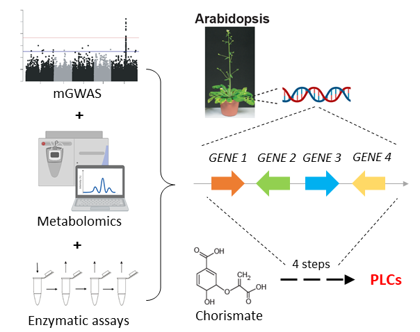 Plants produce arrays of specialized metabolites that are crucial for plant development, defense and interactions with the ever-changing environment. Discovery of metabolites and metabolic pathways by dissecting the underlying genetic basis is an important challenge, not only to increase our understanding of life, but also to provide indispensable applications for humans such as pharmaceuticals. In this project we have investigated the occurrence and biosynthesis of a novel metabolic class of phenol-like compounds (PLC), that was discovered by the host group in the plant model Arabidopsis (unpublished). Notably, chemically synthesized PLC and analogues are in vitro inhibitors of enzymes at branch points in the biosynthesis of a plethora of essential molecules. This inhibitory activity hints to a potential biological role for PLCs in regulating the flux through these pathways, opening perspectives for applications. The direct objective of my project is to unravel the biosynthetic pathway of PLCs. We therefore aim i) to structurally identify additional pathway intermediates and sinks via LC-MS based metabolite profiling and purification followed by NMR, ii) to feed plants with Stable Isotope Labeled precursor molecules, followed by analyzing the MS fragmentation spectra of the labeled molecules, iii) to investigate the role of an operon-like gene cluster involved in the biosynthesis of PLCs via reversed genetics, and iv) to obtain insight in the in planta role of PLC by feeding experiments followed by comparative metabolic profiling.