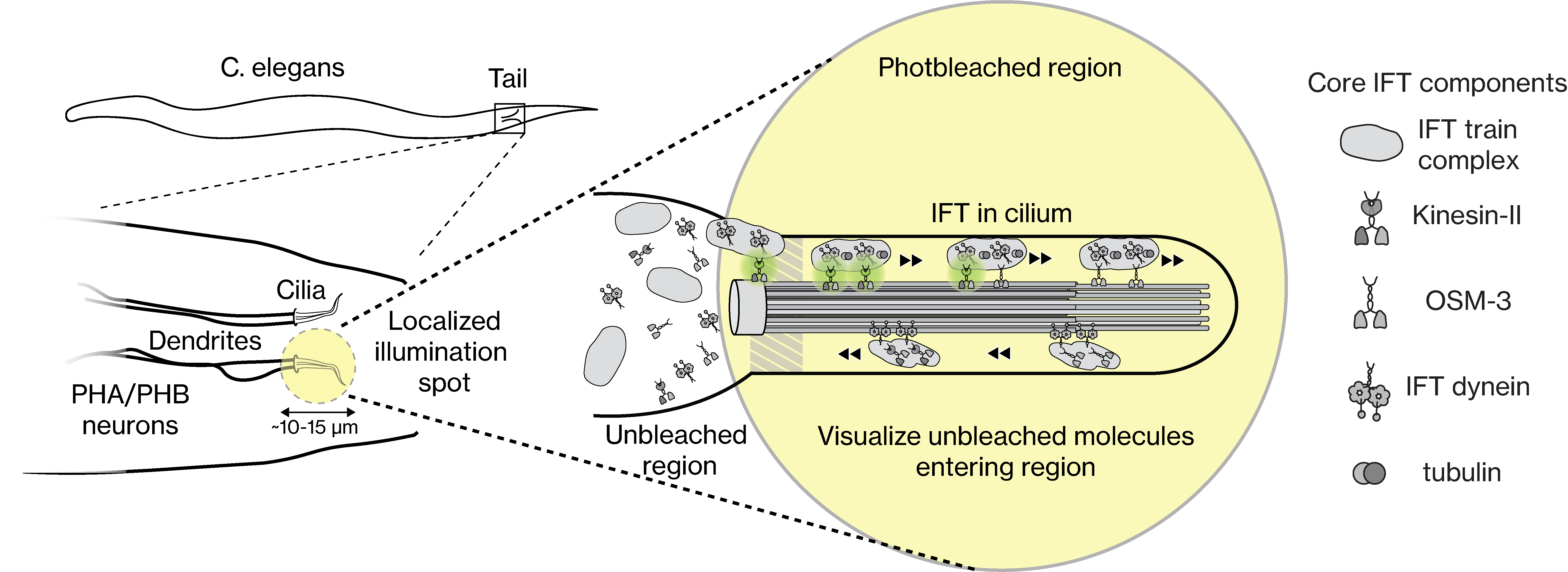 A new microscopy technique, SWIM was implemented to obtain detailed single molecule information in C. elegans chemosensory cilia (Figure). The essential idea is to control the epi-fluorescence illumination beam size to only illuminate the region of interest. Using a high laser power, one can bleach all molecules that are within the illuminated region, but any new molecule that enters the region is not bleached and can be imaged until it bleaches.