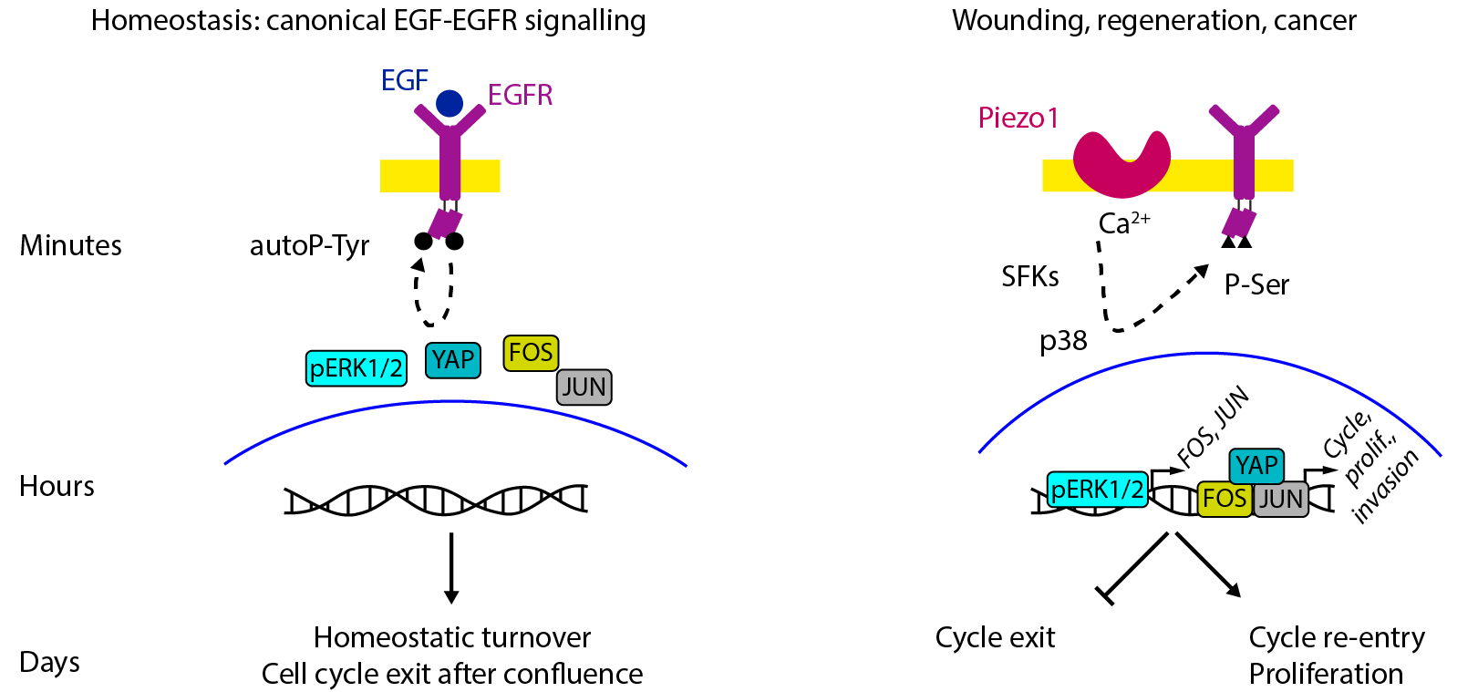 PROMIGREX has found that Piezo1-dependent EGFR signalling does not involve canonical tyrosine phosphorylation or the kinase activity of EGFR. Instead, this newly identified axis signals via kinases of the Src and p38 families. These findings may help explaining cancer resistance to Tyrosine Kinase Inhibitors and EGFR-blocking antibodies (an unmet medical need) and could be exploited in new therapeutical approaches. Further pre-clinical research will elucidate this.