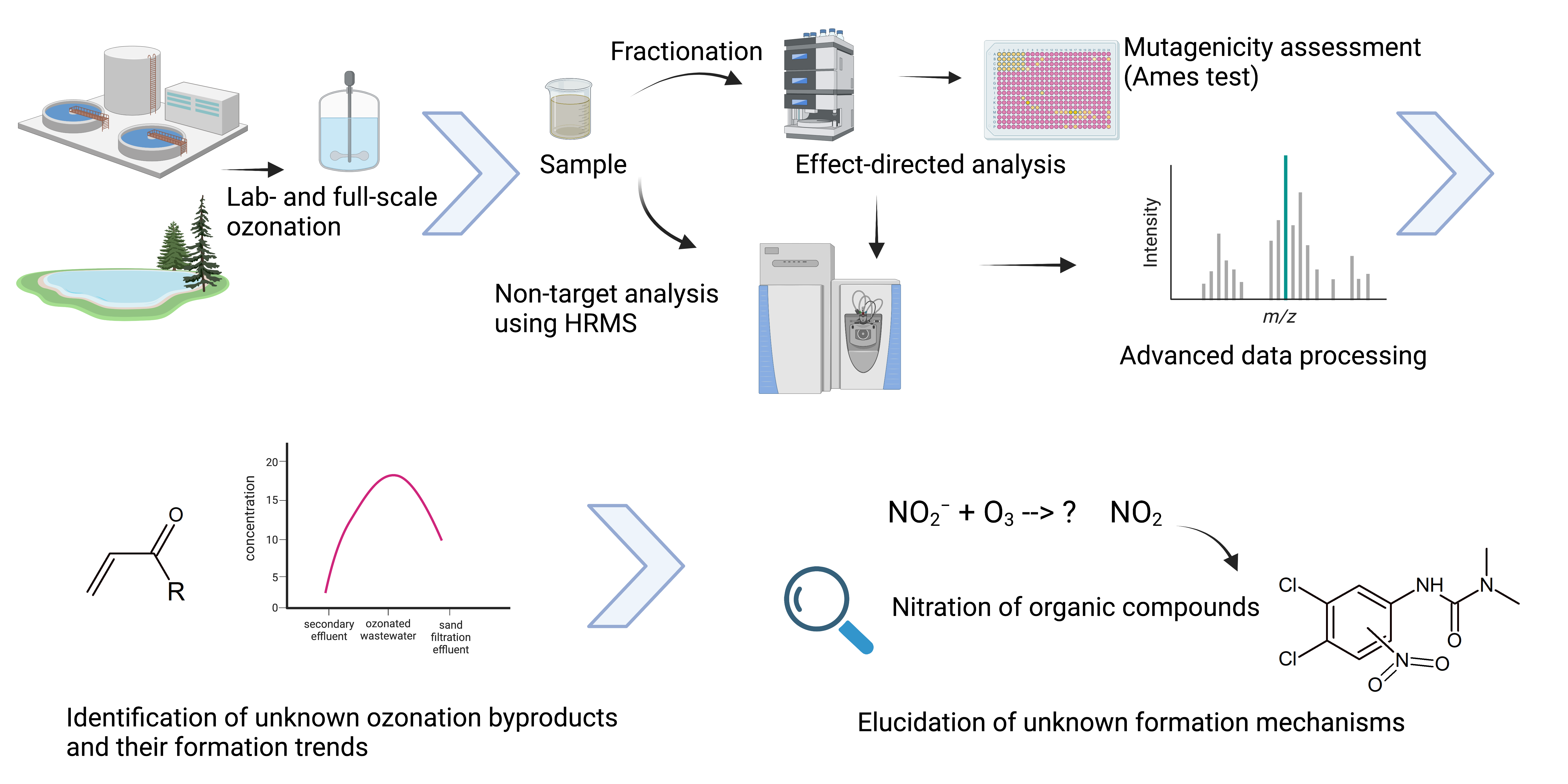 Overall, the findings from OzoToxID confirmed the systematic formation of mutagenicity during wastewater ozonation. Subsequent sand filtration allowed to either partially or entirely eliminate the mutagenic byproducts. Nitrite concentration, the applied ozone dose, and the Dissolved Organic Matter (DOM) type played a critical role in the formation of mutagenicity during ozonation. The presence of nitrite in wastewater resulted in a higher formation of mutagenic byproducts during ozonation. This was also accompanied by the formation of nitrocompounds from organic precursors, in a pathway which presumably involves nitrogen dioxide (NO2) as nitrating agent. A unique fingerprint was attributed to effluent DOM in the formation of mutagenicity, in contrast to other DOM types (e.g. lake water, gray water), for which only negligible or very low mutagenicity was formed during ozonation. Furthermore, a novel non-target screening method for the analysis of carbonyl compounds has been validated and applied for the assessment of carbonyl compound formation during ozonation of different water matrices.