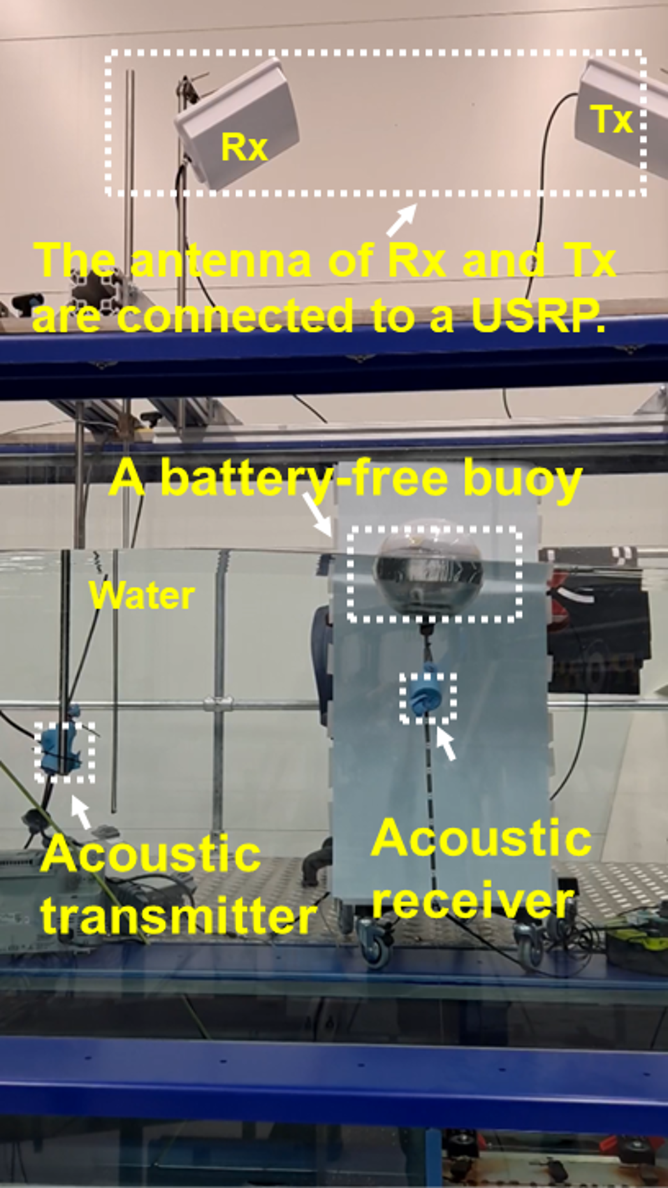 5) Real-World testing: The project has built a prototyping for the battery-free buoy and implemented a test bed to evaluate and validate the buoy's performance on a wavy water surface. This involved testing the buoy in a controllable wave tank and measuring its performance under different wave patterns to identify any design flaws in the buoy's shape, the proposed backscatter communication technology, and the channel estimation and equalization methods. These results will help refine the technology for future practical applications.