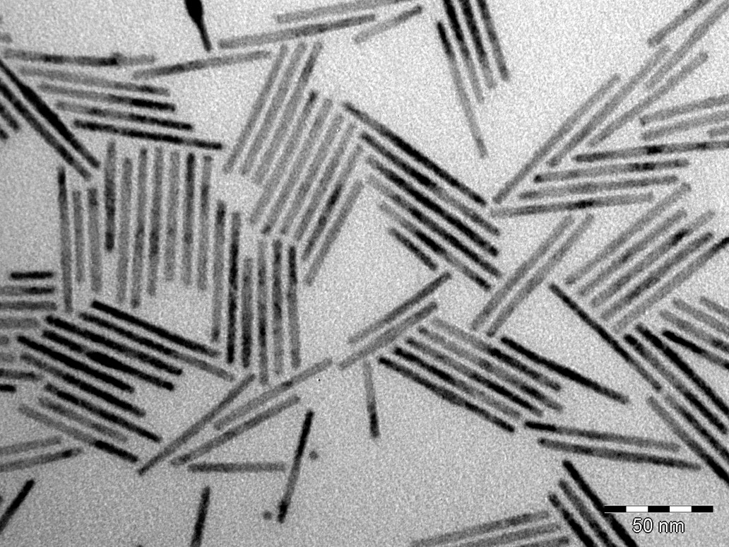 The nanorods were synthesized in an organic solvent, which was not biocompatible. Thus, the nanorod surface was modified and the nanorods were transferred to aqueous media. This was achieved by using a specific polymer, which comprised hydrophobic and hydrophilic parts. This polymer was wrapped around the nanorods. By this, stable nanorod dispersions were achieved in water, in salt solutions and in cell culture media.