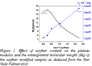 Measuring the dilute solution viscosity studies further helped to confirm the aggregation of surfmer modified chains in solution, compared to polystyrene homopolymer prepared without any surfmer. The copolymer prepared with 2.31 and 4.52 mol% surfmer content were insoluble in tetrahydrofuran (THF), anticipated due to stronger association of the polymer chains through sulfonic acid groups. The thermal and dynamic mechanical studies also show signatures of both plasticising effect by the alkyl groups and the polar interactions through sulphonic acid groups operating in such systems. The rheological properties were evaluated in detail for the surfmer modified sample. The chain aggregation through H-bonding of polar sulfonic acid groups and the branching effect were reflected in the melt rheological properties, as an increase of the plateau modulus (Gp) and a shift of the rubbery flow crossover point to lower frequencies. Such results might be anticipated if the existence of aggregated structures, which acts as physical crosslinks whose concentration increase with increasing surfmer content, is assumed. Thus, ionic reactive surfactants due to the specific structural characteristics impart ionomer character as well as internal plasticisation to the formed polymer, due to the polar sulfonate group and the alkyl chains of the surfmer, respectively. The observed results are in direct agreement with the increase in aggregation observed during SLS studies. These finding may help in understanding the enhanced properties of surfmer modified latex films.