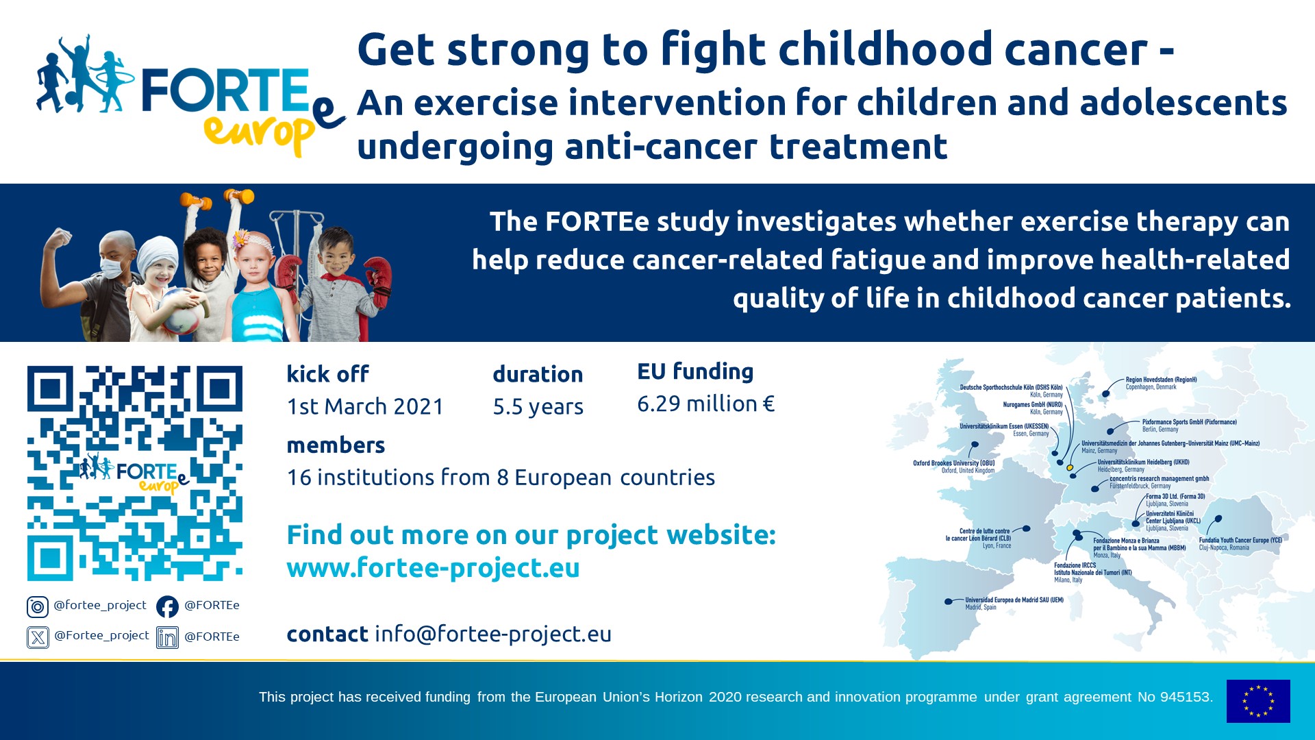 Previous studies in adult cancer patients have shown multiple beneficial effects of specific exercise training: An improvement in exercise capacity was associated to a reduced risk of morbidity and mortality in adult cancer patients. A similar effect has not been clearly demonstrated in children and adolescents yet, but personalised exercise training during the intensive phase of childhood cancer treatment seems to be a promising therapy to mitigate above-mentioned issues. However, evidence for using exercise to counteract cancer-related fatigue and improve health-related quality of life is still lacking in paediatric oncology. Until now, precision exercise training has not yet been part of standard care in paediatric oncology and does therefore not reach most patients. This is where FORTEe steps in to promote exercise therapy, which aims to make young patients stronger for fighting childhood cancer. The overall goal of the FORTEe project is to create high-level evidence for the use of precision exercise interventions in childhood cancer by conducting the world’s largest randomised, controlled trial in this field. We intend to evaluate a personalised and standardised exercise intervention in 450 children, adolescents and young adults undergoing cancer treatment in nine centres across Europe in order to generate evidence for an innovative, patient-centred exercise treatment. Experiences and expertise in paediatric exercise oncology within Europe are merged to develop specific age-adapted and personalised exercise training as well as testing protocols, which are implemented with the help of digital, innovative technologies. During the project lifetime of 5.5 years, FORTEe aims to generate meaningful advances in clinical care for children and adolescents with cancer. This will enable future access to adapted exercise training to children with cancer all over the EU and increase the children’s health-related quality of life.