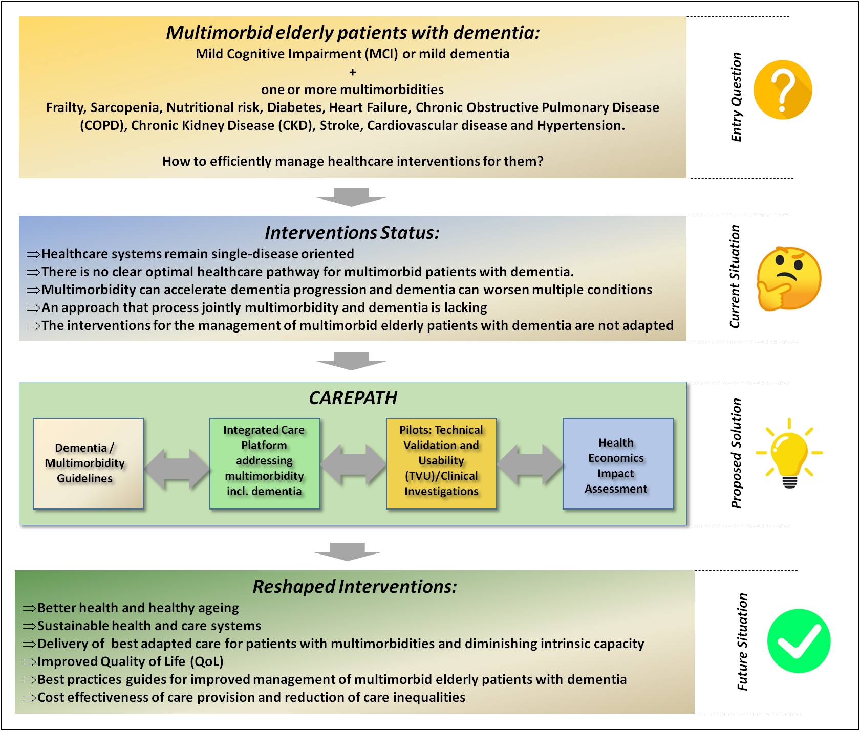 - Specific Objective 1 (SO1): Develop a holistic, open-standards based, inclusive, cross-sectoral and interdisciplinary patient-centred approach to improve the Quality of Life (QoL) of elderly patients, whose multimorbidity includes dementia.