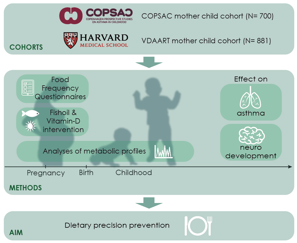 Therefore, the DEFEND research project will use data form the COPSAC and VDAART cohorts resembling more than 1,500 mother-child pairs aiming to understand: 1) how diet and diet supplements in pregnancy and early life shapes the mother’s and child’s metabolic profiles by measuring their blood metabolome, i.e. all small-molecule metabolites, 2) the connection between these metabolic profiles and risk of developing asthma, ADHD, and autism in childhood, and 3) the mechanisms whereby diet and diet supplements can protect young children against developing these common childhood disorders, which is expected to have a significant impact on the children, their families and the society.