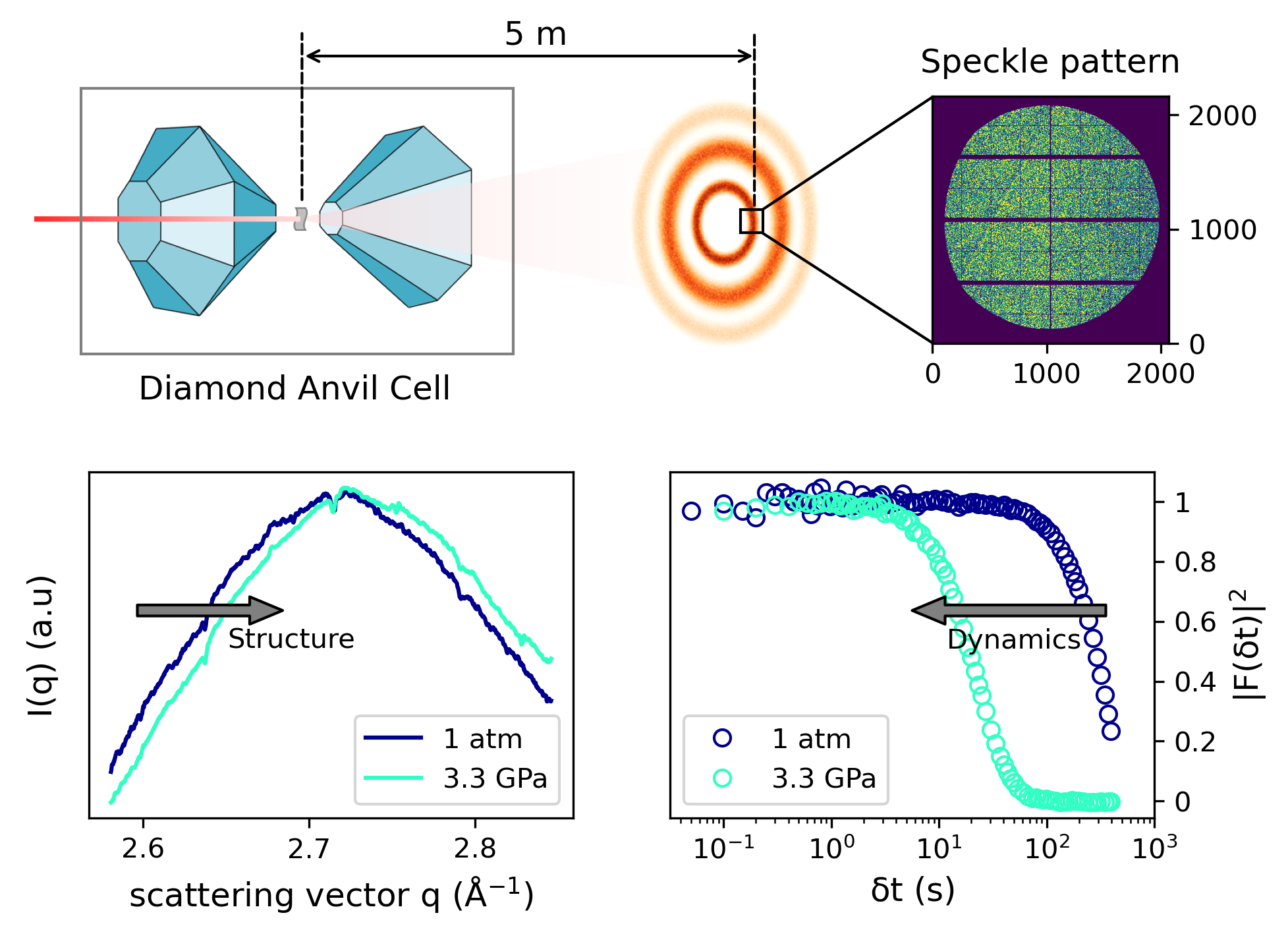 For the first topic, we probed the dynamics and structure in two different ultra-viscous metallic liquids on approaching the glass transition from the supercooled liquid phase. This work, discussed in Comm. Phys. 5, 316, (2022), helps elucidating the microscopic mechanisms beyond the glass transition, a dynamical process that keeps fascinating scientists since many decades. When a liquid glass-former is cooled close to the glass transition temperature, its viscosity increases rapidly over several order of magnitude in a very narrow temperature range until the system falls out of equilibrium and becomes a disordered solid, a glass, with no apparent structural changes. This process corresponds to an increasingly sluggish particle motion whose nature is still highly debated, mainly due to the lack of approriate experimental methods able to probe the particle motion. In our work, we provide such information from the wavelength dependence of the structural relaxation process and show that the dynamics not only reflects the topological order of the material, but also the chemical short-range order, which can lead to a surprising slowdown of the structural relaxation process at the mesoscopic scale. We also found a strong connection between the degree of heterogeneous dynamics of the supercooled liquid – a fascinating feature of all glass formers – and the rigidity of the melt structure, supporting the idea of a structural origin beyond the glass transition.