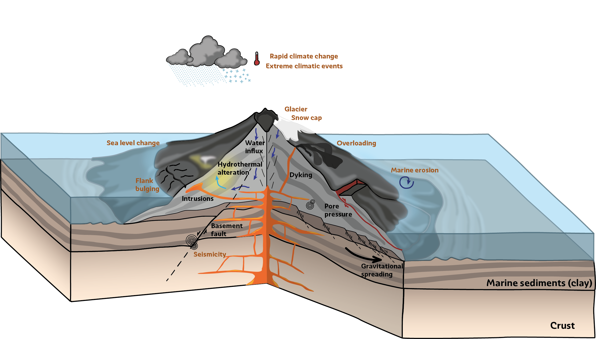 The main result of all work done in the reporting period is that there appears to be a strong link between flank collapses and eruptions. We find increasing evidence for that flank collapses precede large eruptions and not vice versa. This would exclude exceptionally large eruptions as triggers for flank collapse.