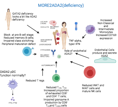 We have performed the first viral exposure experiments in both peripheral blood cells as well as in cell lines, by CRISPR-CAS9 editing. When looking at phenocopies (lookalikes) of ADA2 deficiency, we have identified a novel gene defect in a patient referred for investigation of potential underlying DADA2. Moreover, we were able to confirm the reduced ADA2 serum acitivity (to DADA2 carrier range) in patients with confirmed GATA2 deficiency and are further exploring the pathophysiological link between ADA2 and GATA2 deficiency. The diminished levels can’t be attributed to leukopenia in GATA2 deficiency as patients with leukopenia due to chemotherapy in the context of stem cell transplantation maintained their ADA2 serum enzyme activity. Finally, we were able to show ADA2 expression and secretion by human endothelial cells of varius organs of interest, which will open up new avenues of investigation on the pathogenesis.