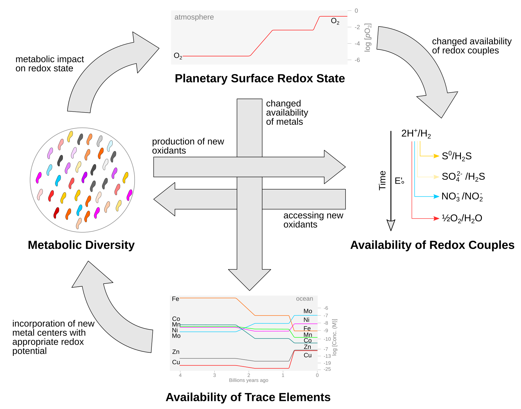 Earth and Life have coevolved over time, influencing each other’s evolutionary trajectory and ultimately keeping our planet habitable for the last 4 billion years. Microorganisms in the environment play a large role in mediating the interactions between Earth’s geosphere and biosphere, controlling a large portion of the cycle of elements and nutrients. The majority of the key microbial chemical reactions that control the cycle of elements are carried out by a small set of proteins containing a redox-sensitive transition metal as their core catalytic center. Elements used include, among others, transition metals such as Fe, Mo, W, Zn, Cu, V, Mn, Ni and Co and non-metals like S and Mg. The availability of these metals is largely controlled by abiotic reactions in diverse ecosystems, and it has changed over the course of Earth’s history as a result of changing redox conditions, particularly global oxygenation. Empirical data from diverse fields suggest that the availability of transition metals can influence the type of microbial communities, and in turn their ecosystem functions, found in different ecosystems. Despite this, there is a lack of fundamental knowledge on distribution and availability of transition metals in controlling microbial diversity. COEVOLVE will elucidate the impact of transition metal availability on microbial functional diversity, combining fieldwork, laboratory experiments, and computational approaches. COEVOLVE will: 1) investigate the relationship between the availability of trace metals and microbial functional diversity in extant ecosystems and organisms; 2) link metabolic diversity and metal availability to different geological, geochemical, and mineralogical conditions; 3) link metabolic diversity and dependence on metal availability to the emergence and evolution of different metabolisms; and 4) determine the timing of major steps in metabolic evolution and link them to geochemical proxies of planetary surface redox change. Understanding the role of trace metal environmental distribution and availability in influencing microbial functional diversity might hold the key to understanding the co-evolution of Life and Planet Earth, unlocking a number of important discoveries at the core of diverse fields such as earth sciences, astrobiology, microbial ecology, and biotechnology.