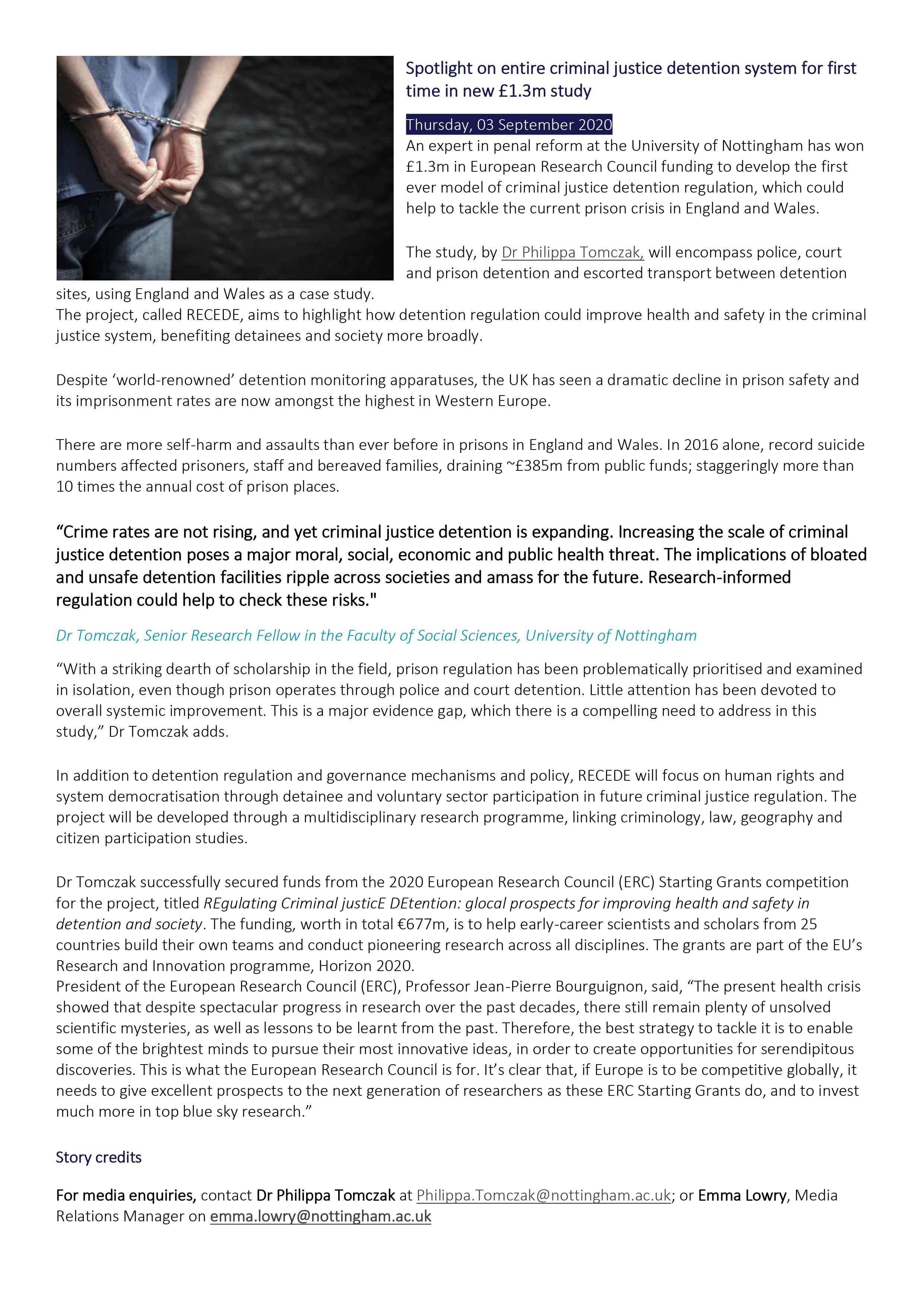 REgulating Criminal justicE DEtention: glocal prospects for improving health and safety (RECEDE) aims to develop the first comprehensive, empirically generated model of criminal justice detention regulation, to facilitate new understandings of how detention regulation could improve health and safety – in detention and society. RECEDE’s objectives are to: