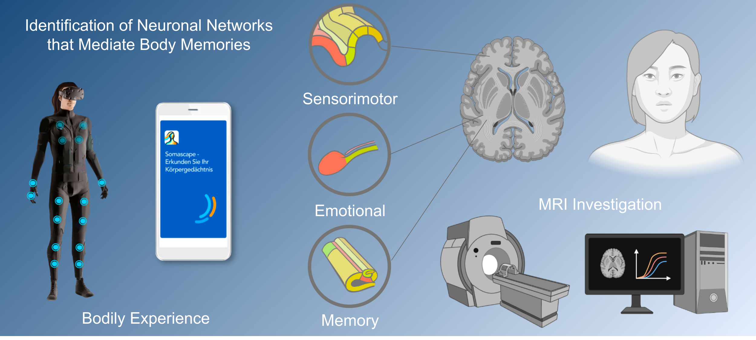 WP3: To clarify if memory training can reduce psychosomatic symptoms, we investigate the effect of the “Somascape” App on somatization, mental health, self-awareness, and reflective functioning. Pre and post fMRI investigations allow us the identification of biomarkers that indicate the likelihood of an expected successful intervention. To identify mechanisms of remapping, we will clarify whether the modulatory effect of the think/no-think paradigm can be used to induce memory suppression, and which neuronal networks underlie this effect. In addition, the most efficient metrics of tactile remapping will be explored using the full-body haptic/VR paradigm. Specifically, it will be clarified if changing tactile and/or visual features of the original experience is more efficient in altering body memories. These insights will pave the way towards new interventions to reduce somatic symptoms in participants and patients.