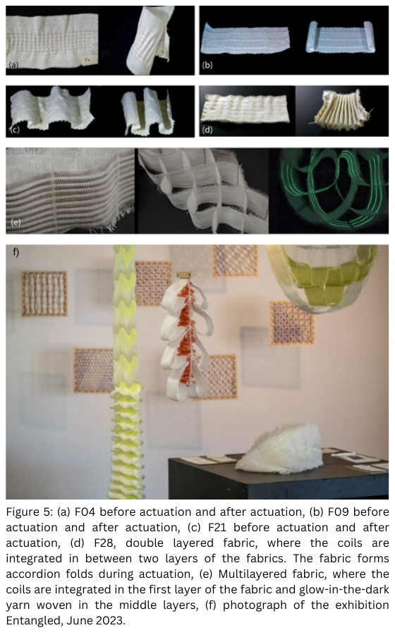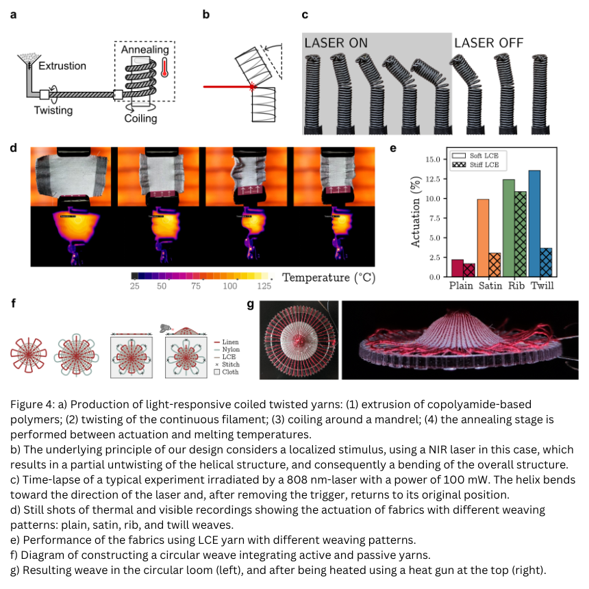 In the second year of the project, a significant milestone was achieved by using Liquid Crystalline Elastomer (LCE) yarns. This advancement was made possible in a short time through a collaborative effort with a group from the University of Cambridge. The use of LCE yarn approached the goal of providing large-stroke and reversible actuation and providing outputs suitable for being used in standard textile production methods, such as weaving, and traditional crafts, like bobbin lace. The actuation results showed that different outcomes can be realized when combining passive and active yarns: (1) contraction of the overall structure, Figure 4 d-e; and (2) three-dimensional shapes from flat arrangements, Figure 4 f-g. This achievement was also published in the prestigious journal, Advanced Materials, and the related press release reached wide attention.