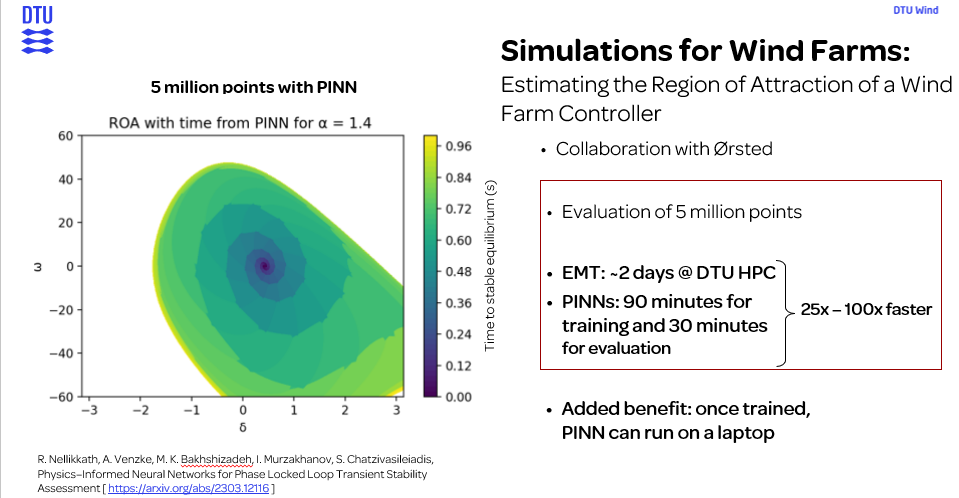 Our team was the first to introduce physics-informed neural networks in the field of power systems. During the project, we worked with the leading offshore wind developer in the world, the Danish company Ørsted. Ørsted is strongly interested in speeding up their simulations as this can accelerate their wind farm design processes and reduce the time to construction. We showed that PINNs can achieve a 100x speedup of these simulations: to be specific, we achieved a computation time of approx. 30 minutes for both training and evaluation of the PINNs, instead of 2 days that conventional tools would have required.