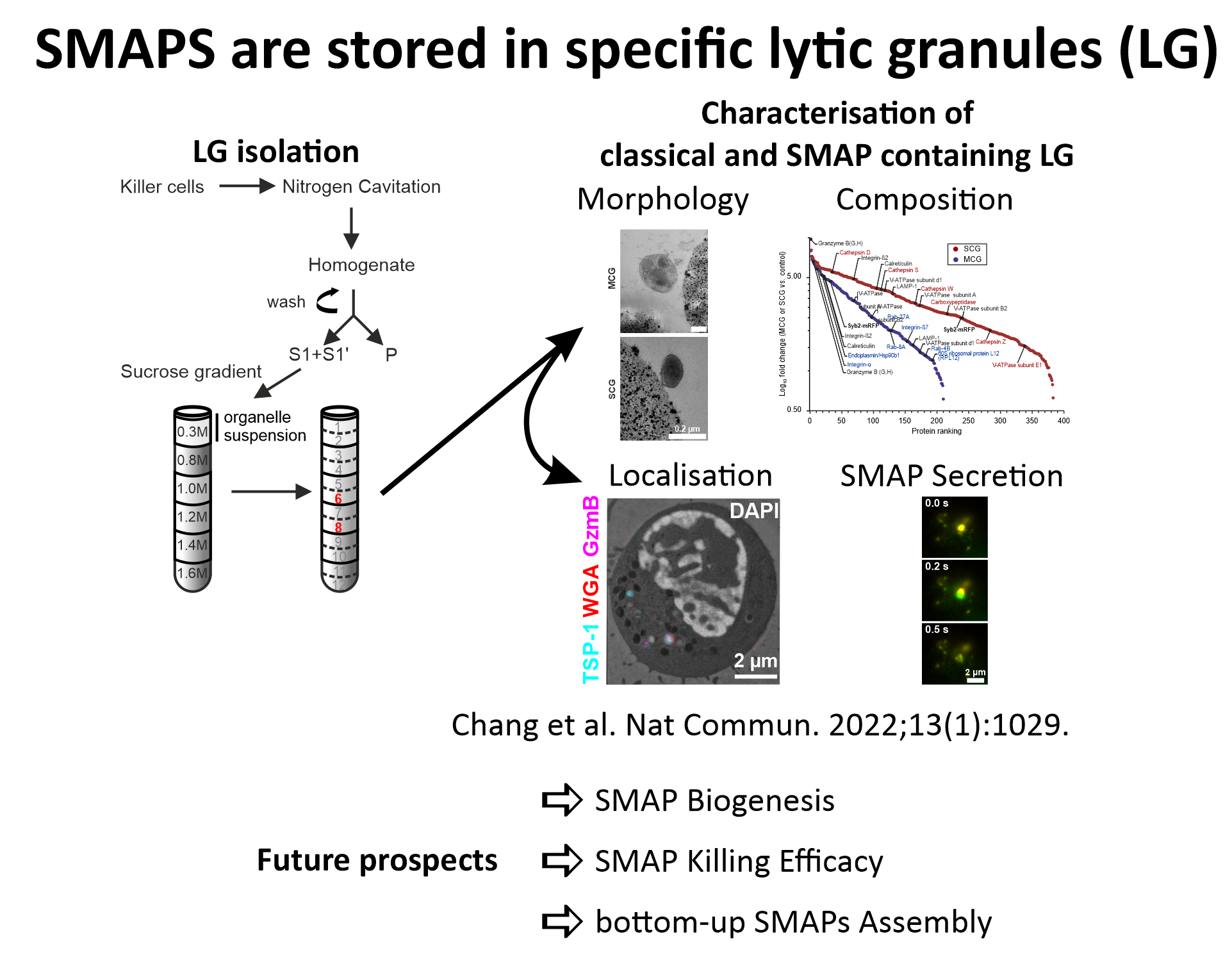 b) We succeeded in identifying the storage sites for the spray-like and bomb-like release of cells destroying molecules (PMID: 35210420).