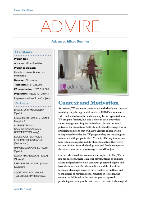 The main goal of AdMiRe is to develop, validate and demonstrate innovation solutions, based on Mixed Reality (MR) technology, which will allow for audiovisual media audiences a step change in interactivity, and that will bring for content creators a radical improvement in talent immersion and interaction with computer generated elements.