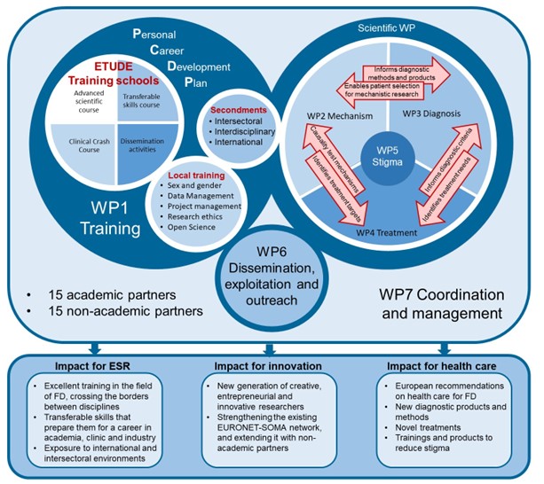 These challenges result in a lack of knowledge on FD, leading to fragmented and insufficient health care for patients with FD, and a society in which patients with FD experience stigma from both the society as well as from health care professionals. There is an urgent need to solve the fragmented and insufficient education and research landscape. For this reason EURONET-SOMA has envisioned ETUDE: a sustainable and structure training programme that educates a new generation of interdisciplinary creative early stage researchers (ESR) that are able to cross disciplines and to translate theory and experimental models to products and services that improve care for patients.