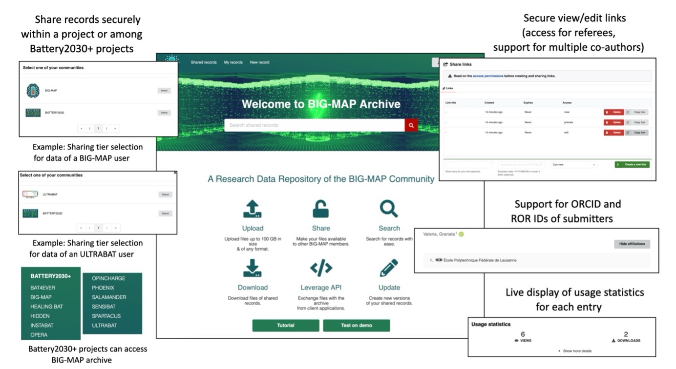 The BIG-MAP project developed a tiered and scalable battery archive (https://archive.big-map.eu(odnośnik otworzy się w nowym oknie)) based on the InvenioRDM architecture developed at CERN that underpins Zenodo (see figure 1). Notably, the BIG-MAP Archive serves as a private repository to all the BIG-MAP partners, but, thanks also to the community feature of InvenioRDM, it can now be used to serve independently and privately the other BATTERY 2030+ projects with multiple sharing tiers, allowing either for secure data sharing within a given project or giving access to the data to all BATTERY2030+ projects. The private data can also be pushed publicly to the Materials Cloud Archive, which has a public DOI and guaranteed availability for 10+ years.