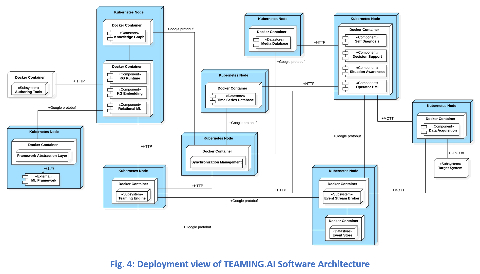 The development of the Use Cases started with a requirement engineering and the description of user stories that will be used as anchor points for validation tests of teaming scenarios. The requirement engineering included an importance evaluation of an extended list software quality attributes (scalability, robustness) that also included attributes towards teaming aspects (trustworthiness, explicability). Based on this assessment, a reference software architecture for the TEAMING.AI platform has been developed that has a special focus on scalability and timing requirements of ML components and the KG runtime layer (see Fig. 3).