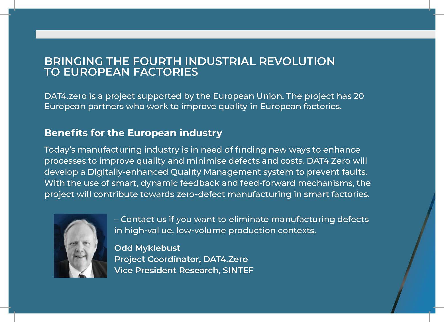Overall, DAT4.ZERO will support the European factories of the future by increasing equipment productivity through rapid detection and correction of product- and process errors, reducing ramp-up time, decreasing time-to-market of existing and evolving high-value products and increasing product quality, also reducing quality costs, scrap, and rework.