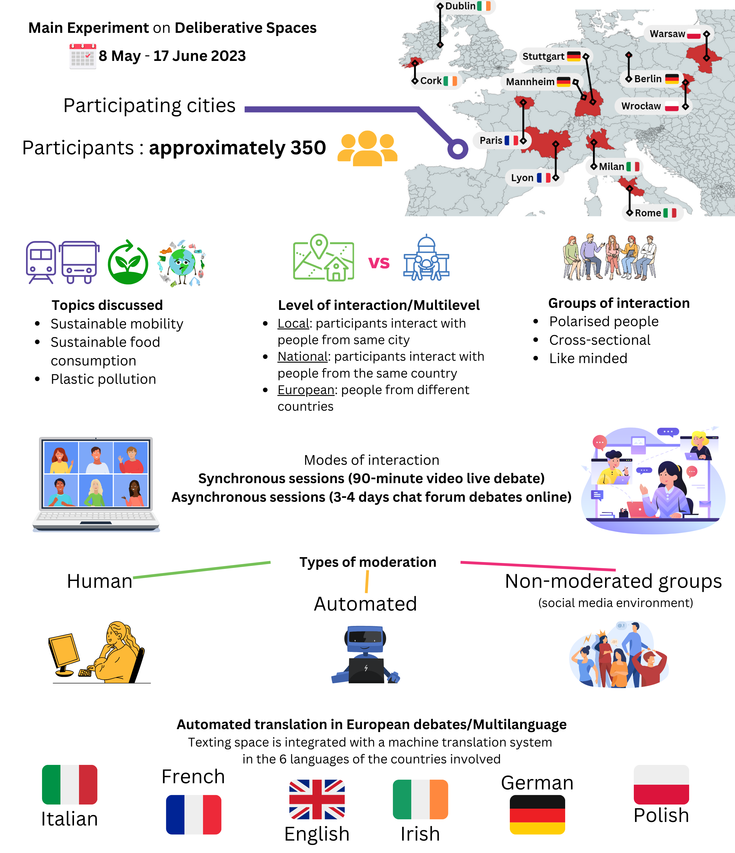 The first design innovation consisted in developing a multi-level process, where people could gradually raise awareness of multilevel contexts. Accordingly, the mini-publics changed their composition during the deliberation days: first, they were composed by citizens from the same city, then by people from two cities of the same country, and finally by people from different countries. To support interactions among European citizens, the “Convivium” platform integrated a machine translation tool.